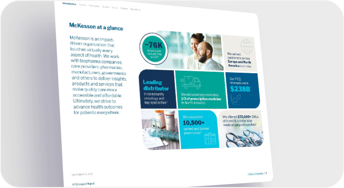 McKesson at a glance McKesson is an impact- driven organization that touches virtually every aspect of health. We work with biopharma companies, care providers, pharmacies, manufacturers, governments and others to deliver insights, products and services that make quality care more accessible and affordable. Ultimately, we strive to advance health outcomes for patients everywhere. Introduction Stories Employees Access Equity Climate Operations *As of March 31, 2021 ~76K employees around the world * Leading distributor in community oncology and key specialties * We served customers across Europe and North America each day We delivered approximately 1/3 of prescription medicine in North America We offered 275,000+ SKUs of brand & private label medical-surgical supplies * We supported 10,500+ owned and banner pharmacies * Our FY21 revenues were $238B * >Table of Contents | 6 FY21 Impact Report