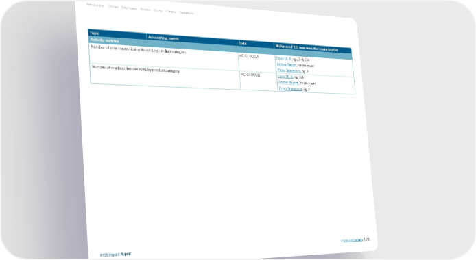 Topic Accounting metric Code McKesson FY21 response/disclosure location Activity metrics Number of pharmaceutical units sold, by product category HC-DI-000.A Form 10-K , pgs. 3-8, 134 Annual Report , inside cover Proxy Statement , pg. 2 Number of medical devices sold, by product category HC-DI-000.B Form 10-K , pg. 134 Annual Report , inside cover Proxy Statement , pg. 2 Introduction Stories Employees Access Equity Climate Operations >Table of Contents | 78 FY21 Impact Report