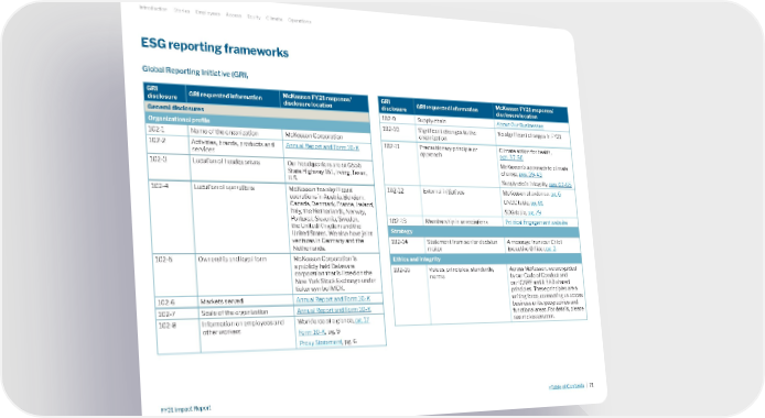 ESG reporting frameworks GRI disclosure GRI requested information McKesson FY21 response/ disclosure location General disclosures Organizational profile 102-1 Name of the organization McKesson Corporation 102-2 Activities, brands, products and services Annual Report and Form 10-K 102-3 Location of headquarters Our headquarters are at 6555 State Highway 161, Irving, Texas, U.S. 102-4 Location of operations McKesson has significant operations in Austria, Belgium, Canada, Denmark, France, Ireland, Italy, the Netherlands, Norway, Portugal, Slovenia, Sweden, the United Kingdom and the United States. We also have joint ventures in Germany and the Netherlands. 102-5 Ownership and legal form McKesson Corporation is a publicly held Delaware corporation that is listed on the New York Stock Exchange under ticker symbol MCK. 102-6 Markets served Annual Report and Form 10-K 102-7 Scale of the organization Annual Report and Form 10-K 102-8 Information on employees and other workers Workforce at a glance, pg. 17 Form 10-K , pg. 9 Proxy Statement , pg. 6 GRI disclosure GRI requested information McKesson FY21 response/ disclosure location 102-9 Supply chain About Our Businesses 102-10 Significant changes to the organization No significant changes in FY21 102-11 Precautionary principle or approach Climate action for health, pgs. 37-50 McKesson’s approach to climate change, pgs. 39-43 Supply chain integrity, pgs. 62-65 102-12 External initiatives McKesson at a glance, pg. 6 UNGC table, pg. 81 SDG table, pg. 79 102-13 Membership in associations Political Engagement website Strategy 102-14 Statement from senior decision maker A message from our Chief Executive Officer, pg. 3 Ethics and integrity 102-16 Values, principles, standards, norms Across McKesson, we are guided by our Code of Conduct and our ICARE and ILEAD shared principles. These principles are a uniting force, connecting us across business units, geographies and functional areas. For details, please see mckesson.com. Global Reporting Initiative (GRI) Introduction Stories Employees Access Equity Climate Operations >Table of Contents | 71 FY21 Impact Report
