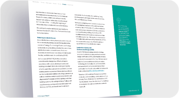 opportunities to incorporate them into our fleet and realize emissions reductions. Our U.S. Medical- Surgical business, which owns and operates the largest fleet within our enterprise, recently placed its first order of EVs — marking the beginning of integrating these vehicles into our overall strategy. We continue to explore additional opportunities to increase the electrification of our fleet and drive down fuel consumption. Reducing our electricity use In our distribution centers, pharmacies and offices, we focus on reducing energy use and finding alternative sources of energy. Our most significant use of energy is electricity in our buildings, whether they are offices, distribution centers or warehouses. Across our locations, we work to use less energy for lighting and heating, ventilation and air conditioning (HVAC). In fiscal year 2018 (FY18), McKesson made a commitment to design new office buildings in accordance with a newly developed connected buildings standard. We’re also making an ongoing effort to apply this standard retroactively to as many existing assets as practical. This technology will give our teams elevated visibility to building operations, as well as a real-time analytics platform to identify and diagnose inefficiencies in HVAC, lighting and other building systems. We anticipate these findings will result in energy savings and extended equipment lifetimes. In FY21, we transitioned locations in Jacksonville, Fla.; Scottsdale, Ariz.; and Irving, Texas, into the program, and began similar work in Columbus, Ohio, and Mississauga, Ontario. We implement lighting retrofit projects to convert less efficient lighting fixtures to LEDs, which use far less electricity. Since FY20, in the U.S., we have realized an estimated average reduction of 23% in our electricity use at participating buildings due to these LED installations across 30 locations covering more than 6.3 million square feet. This equates to a reduction of 19.9 million kilowatt hours (kWh) of electricity. In FY21, we expanded the program to 450,000 additional square feet across two distribution centers. Leadership in Energy and Environmental Design (LEED) As part of McKesson’s energy reduction strategy, we pursue Leadership in Energy and Environmental Design certification (LEED), when feasible, for newly constructed or renovated U.S. offices. We have earned LEED for Commercial Interiors Gold certification for Building 3 in Scottsdale, Ariz., in October 2020, and earned LEED for Commercial Interiors Silver certification for offices in Jacksonville, Fla. Jacksonville is also undergoing WELL Building certification . These two LEED certified offices join our portfolio of already-certified buildings, which includes offices in Irving, Texas; Richmond, Va.; San Francisco, Calif.; The Woodlands, Texas; the other two office buildings in Scottsdale, Ariz.; and our distribution center in Aurora, Ill. Since FY20, in the U.S., we have realized an estimated average reduction of 23% in our electricity use at participating buildings due to these LED installations across 30 locations covering more than 6.3 million square feet . Introduction Stories Employees Access Equity Climate Operations >Table of Contents | 41 FY21 Impact Report