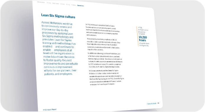 Lean Six Sigma culture Across McKesson, we strive to continuously assess and improve our day-to-day processes by applying Lean Six Sigma methodology and principles. Lean Six Sigma training and methodology has enabled — and continues to enable — employees at all levels of the organization to make data-driven decisions to foster quality-focused improvements and perpetuate continuous improvement efforts for our partners, their patients, and employees. In FY21, McKesson completed 324 Six Sigma business process improvement projects, which had more than $223 million in estimated cost savings and cost avoidance across our company, suppliers and customers. These projects place heavy emphasis on defect reduction, faster cycle time and reduced waste. They have helped to reduce the number of variations customers experience and to identify what factors may drive that variation. In addition to delivering cost-benefit initiatives, one of Six Sigma’s key objectives is to train, coach and mentor employee talent. This allows us to deepen our culture of continuous improvement across McKesson. In FY21, employees across 10 countries completed 10,210 hours of Lean Six Sigma training courses. In Europe, we introduced the Green Six Sigma initiative to further anchor environmental and sustainable aspects as a permanent component of the Lean Six Sigma program. In FY21, Green Six Sigma projects reduced an estimated 37 tons of carbon emissions from our Scope 3 footprint. In FY21, employees across 10 countries completed 10,210 hours of Lean Six Sigma training courses. Introduction Stories Employees Access Equity Climate Operations >Table of Contents | 66 FY21 Impact Report