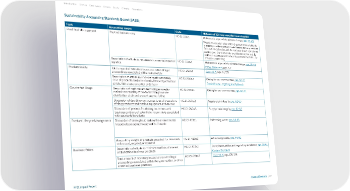 Topic Accounting metric Code McKesson FY21 response/disclosure location Fleet Fuel Management Payload fuel economy HC-DI-110a.1 McKesson’s approach to climate change, pgs. 39-43 We utilize a combination of third-party transportation & logistics providers and a private fleet of delivery vehicles for product deliveries. We do not have direct operational control over the third-party provider deliveries and do not have access to all third-party partners' fuel data for emissions reporting. Description of efforts to reduce environmental impact of logistics HC-DI-110a.2 McKesson’s approach to climate change, pgs. 39-43 Proxy Statement , pgs. 5, 7 Product Safety Total amount of monetary losses as a result of legal proceedings associated with product safety HC-DI-250a.1 Form 10-K , pgs. 37, 123 Description of efforts to minimize health and safety risks of products sold associated with toxicity/chemical safety, high abuse potential, or delivery HC-DI-250a.2 Caring for our communities, pgs. 30-31 Opioid Abuse - Fighting the Epidemic Counterfeit Drugs Description of methods and technologies used to maintain traceability of products throughout the distribution chain and prevent counterfeiting HC-DI-260a.1 Caring for our communities, pgs. 30-31 Discussion of due diligence process to qualify suppliers of drug products and medical equipment and devices HC-DI-260a.2 Supply chain integrity, pgs. 62-65 Discussion of process for alerting customers and business partners of potential or known risks associated with counterfeit products HC-DI-260a.3 Supply chain integrity, pgs. 62-65 Product Lifecycle Management Discussion of strategies to reduce the environmental impact of packaging throughout its lifecycle HC-DI-410a.1 Addressing waste, pgs. 44-46 Amount (by weight) of products accepted for take-back and reused, recycled, or donated HC-DI-410a.2 Addressing waste, pgs. 44-46 Business Ethics Description of efforts to minimize conflicts of interest and unethical business practices HC-DI-510a.1 Compliance, ethics and regulatory excellence, pgs. 58-61 Code of Conduct Total amount of monetary losses as a result of legal proceedings associated with bribery, corruption, or other unethical business practices HC-DI-510a.2 Form 10-K , pgs. 126-128 Sustainability Accounting Standards Board (SASB) Introduction Stories Employees Access Equity Climate Operations >Table of Contents | 77 FY21 Impact Report