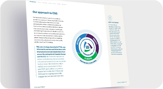 Our approach to ESG Our mission is to improve care in every setting in pursuit of our purpose of Advancing Health Outcomes for All. It is this purpose that drives us to make advancements within our enterprise and beyond. Our core focus areas associated with this model are improving Access to Care, advancing Health Equity and delivering Climate Action for Health in service to our employees, partners, communities and customers, our customers' patients and their families, and the planet. These priorities, along with our unyielding commitment to patient safety and product quality, are the core of our ESG strategy. This new strategy, launched in FY21, was informed by surveys and interviews with internal and external stakeholders from across the enterprise in Canada, Europe and the U.S. We involved employees at various levels from numerous business units and corporate functions to consider multiple views. We intend to conduct an ESG issues assessment in fiscal year 2023, and build on our previous assessment conducted in fiscal year 2018 and the ongoing stakeholder engagement we have led since then. ABOUT THIS REPORT Our Impact Report describes our ESG efforts during FY21 (April 1, 2020 to March 31, 2021). We have attempted to note examples and actions that occurred outside of FY21. This report is organized according to the three pillars of our holistic approach to ESG and includes our approach to the SASB, TCFD, GRI and UNGC frameworks and principles mentioned on pages 71-81 . Please also see our Cautionary Statements on page 82 . Introduction Stories Employees Access Equity Climate Operations >Table of Contents | 8 FY21 Impact Report