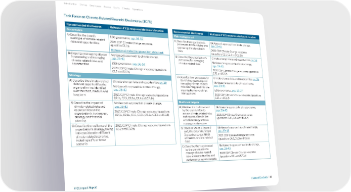 Recommended disclosures McKesson FY21 response/disclosure location Governance A) Describe the board’s oversight of climate-related risks and opportunities ESG governance, pgs. 56-57 2021 CDP Climate Change response (question C1.1b) McKesson climate change position statement B) Describe management’s role in assessing and managing climate-related risks and opportunities McKesson's approach to climate change, pgs. 39-43 ESG governance, pgs. 56-57 2021 CDP Climate Change response (questions C1.2 and C1.2a) Strategy A) Describe the climate-related risks and opportunities the organization has identified over the short, medium and long term Climate change: risks and opportunities, pg. 38 McKesson’s approach to climate change, pgs. 39-43 2021 CDP Climate Change response (questions C2.1a, C2.3, C2.3a, C2.4 and C2.4a) B) Describe the impact of climate-related risks and opportunities on the organization’s businesses, strategy and financial planning McKesson’s approach to climate change, pgs. 39-43 2021 CDP Climate Change response (questions C2.3a, C2.4a, C3.1, C3.1b, C3.2a, C3.3 and C3.4) C) Describe the resilience of the organization’s strategy, taking into consideration different climate-related scenarios, including a 2°C or lower scenario 2021 CDP Climate Change response (questions C3.2 and C3.2a) Recommended disclosures McKesson FY21 response/disclosure location Risk management A) Describe the organization’s processes for identifying and assessing climate-related risks McKesson’s approach to climate change, pgs. 39-43 2021 CDP Climate Change response (questions C2.1, C2.2 and C2.2a) B) Describe the organization’s processes for managing climate-related risks Climate change: risks and opportunities, pg. 38 McKesson’s approach to climate change, pgs. 39-43 2021 CDP Climate Change response (questions C2.1 and C2.2) C) Describe how processes for identifying, assessing and managing climate-related risks are integrated into the organization’s overall risk management Climate change: risks and opportunities, pg. 38 McKesson’s approach to climate change, pgs. 39-43 ESG governance, pgs. 56-57 2021 CDP Climate Change response (questions C2.1 and C2.2) Metrics & targets A) Disclose the metrics used by the organization to assess climate-related risks and opportunities in line with its strategy and risk management process McKesson’s approach to climate change, pgs. 39-43 2021 CDP Climate Change response (questions C4.1, C4.1a and C4.2) B) Disclose Scope 1, Scope 2 and, if appropriate, Scope 3 greenhouse gas (GHG) emissions, and the related risks McKesson’s approach to climate change, pgs. 39-43 2021 CDP Climate Change response (questions C6.1, C6.3 and C6.5) C) Describe the targets used by the organization to manage climate-related risks and opportunities and performance against targets McKesson’s approach to climate change, pgs. 39-43 2021 CDP Climate Change response (questions C4.1 and C4.1a) Task Force on Climate-Related Financial Disclosures (TCFD) Introduction Stories Employees Access Equity Climate Operations >Table of Contents | 80 FY21 Impact Report