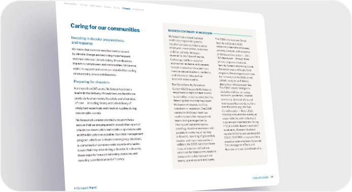 Caring for our communities Investing in disaster preparedness and response We know that extreme weather events caused by climate change are becoming more frequent and more intense. Unfortunately, these disasters impact our employees and communities. McKesson works to support and serve our stakeholders during emergencies, crises and disasters. Preparing for disasters For more than 185 years, McKesson has been a leader in the delivery of medicines and healthcare products to pharmacies, hospitals and other sites of care — including timely and safe delivery of vital pharmaceuticals and medical supplies during catastrophic events. McKesson’s business continuity program helps ensure that we are prepared to absorb the impact of a business interruption and continue operations with as little disruption as possible. Our crisis management program, which we activate in emergency situations, is comprised of company-wide experts who tackle issues that may arise during a disaster. In a disaster, these experts focus on removing obstacles, and ensuring coordination and efficiency. BUSINESS CONTINUITY AT MCKESSON McKesson has a robust business continuity program designed to help the company continue to serve employees, communities, customers and their patients. McKesson takes an “all risk” (loss of people, technology, facility or supplier) approach to resilience, and prepares for both macro-level risks, such as a massive natural disaster or pandemic, and micro-level risks, such as localized severe weather. The Global Security Operations Center (GSOC) supports McKesson’s response to a major incident or crisis by collecting, analyzing and delivering data on global risks that may impact McKesson employees, facilities, operations or reputation. The GSOC assists the McKesson business continuity and crisis management teams during emergencies by filtering and fusing intelligence, providing situational awareness with persistent monitoring of facilities and events, reporting of geopolitical, weather and man-made events. In addition, the GSOC can disseminate mass emergency notifications which can facilitate communications between the crisis management teams, operations and employees. The GSOC also supports Global Security and Safety’s (GSS) mission to protect the employees, property, products, and reputation of McKesson Corporation — 24/7, 365 days a year — through three primary programs: Electronic Security Systems Monitoring, Global Risk Awareness, and Supply Chain programs. These programs comprise the framework of the GSOC, which collects, analyzes, and delivers data to help mitigate global risks. The GSOC collects intelligence related to wildfires, hurricanes, monsoons; pandemics; localized events (e.g., demonstrations and riots); geopolitical events; maritime lane disruptions (e.g., the Suez Canal disruption in March 2021), shipping ports, terrorism events, air cargo incidents, and monitoring of suppliers and manufacturers. During FY21, the GSOC disseminated 5,827 asset alerts, 46 event situational reports (SITREPs), and published 251 COVID-19 SITREPs in support of the executive leadership team, Corporate Crisis Management Team, and Business Unit operational leadership. Introduction Stories Employees Access Equity Climate Operations >Table of Contents | 48 FY21 Impact Report