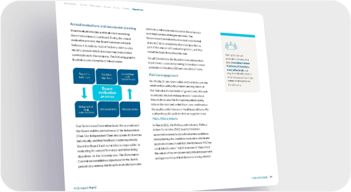 Annual evaluations and succession planning Board evaluations play a critical role in assessing the effectiveness of our Board. During the annual evaluation process, the Board considers where it believes it functions most effectively and may also identify areas in which directors may make better contributions to the company. The following graphic illustrates core elements of this process: Our Governance Committee leads the evaluation of the Board and the performance of the Independent Chair. Our Independent Chair also speaks to directors individually, and that feedback is later reported to the entire Board. Each committee is responsible for evaluating its own performance and determining objectives for the following year. The Governance Committee establishes objectives for the Board, periodically reviews the Board’s evaluation process and makes enhancements based on the company’s evolving business strategies and risks. The Governance Committee has invested a substantial amount of time considering Board composition as part of the annual self-evaluation process, and they revisit the topic throughout the year. For all C-level roles, the Board reviews and provides input on our succession planning to develop our next generation of leaders, CEO and executive officers. Political engagement Our Public Affairs team builds and maintains working relationships with policymakers and regulators at the federal and state levels of government. We seek to educate elected and appointed officials about the solutions we offer to improve patient safety, reduce the cost and variability of care, and improve the quality and efficiency of healthcare delivery. We outline the public policies that we support on our Public Affairs website . In March 2021, the McKesson Employees’ Political Action Committee (PAC) board of directors approved revisions to its political giving guidelines, strengthening the candidate evaluation criteria and approval process. In addition, the McKesson PAC has established a set of “belief statements” that reflect the values of our employee-led political engagement and approach to political discourse among elected During the annual evaluation process, the Board considers where it believes it functions most effectively and may also identify areas in which directors may make better contributions to the company. Board evaluation process Report to full board Establish objectives Committee self- assessments Independent chair conversations Enhancements Periodic review Introduction Stories Employees Access Equity Climate Operations >Table of Contents | 54 FY21 Impact Report