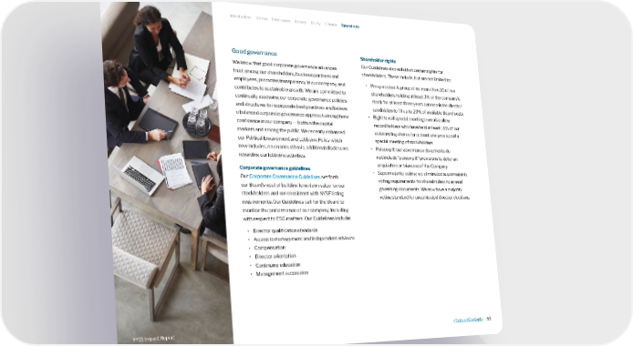 Good governance We know that good corporate governance advances trust among our shareholders, business partners and employees, promotes transparency in our company, and contributes to sustainable growth. We are committed to continually assessing our corporate governance policies and structures to incorporate best practices and believe a balanced corporate governance approach strengthens confidence in our company — both in the capital markets and among the public. We recently enhanced our Political Engagement and Lobbying Policy which now includes, on an annual basis, additional disclosures regarding our lobbying activities. Corporate governance guidelines Our Corporate Governance Guidelines set forth our Board’s goal of building long-term value for our stockholders and are consistent with NYSE listing requirements. Our Guidelines call for the Board to monitor the performance of our company, including with respect to ESG matters. Our Guidelines include: • Director qualification standards • Access to management and independent advisors • Compensation • Director orientation • Continuing education • Management succession Shareholder rights Our Guidelines also establish certain rights for shareholders. These include, but are not limited to: • Proxy access: A group of no more than 20 of our shareholders holding at least 3% of the company’s stock for at least three years can nominate director candidates to fill up to 20% of available Board seats • Right to call special meetings: we also allow record holders who have held at least 15% of our outstanding shares for at least one year to call a special meeting of stockholders • Poison pill: our governance documents do not include “poison pill” provisions to deter an acquisition or takeover of the Company • Supermajority voting: we eliminated supermajority voting requirements for shareholders to amend governing documents. We now have a majority voting standard for uncontested director elections. Introduction Stories Employees Access Equity Climate Operations >Table of Contents | 53 FY21 Impact Report