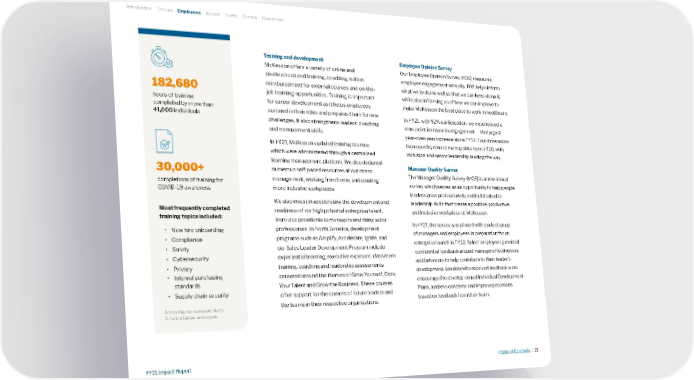 Training and development McKesson offers a variety of online and onsite structured training, coaching, tuition reimbursement for external courses and on-the- job learning opportunities. Training is important for career development as it helps employees succeed in their roles and prepares them for new challenges. It also strengthens leaders’ coaching and management skills. In FY21, McKesson updated training courses which were administered through a centralized learning management platform. We also designed numerous self-paced resources about stress management, working from home, and creating more inclusive workplaces. We also invest in accelerating the development and readiness of our high potential enterprise talent, from vice presidents to managers and rising sales professionals. In North America, development programs such as Amplify, Accelerate, Ignite, and our Sales Leader Development Program include experiential learning, executive exposure, classroom training, coaching and leadership assessments centered around the themes of Grow Yourself, Grow Your Talent and Grow the Business. These courses offer support for the careers of future leaders and the teams in their respective organizations. Employee Opinion Survey Our Employee Opinion Survey (EOS) measures employee engagement annually. EOS helps inform what we’re doing well so that we can keep doing it, while also informing us of how we can improve to make McKesson the best place to work in healthcare. In FY21, with 92% participation, we experienced a nine-point increase in engagement — the largest year-over-year increase since FY17. Four dimensions increased by nine or more points from FY20, with inclusion and senior leadership leading the way. Manager Quality Survey The Manager Quality Survey (MQS) is a new annual survey which serves as an opportunity to help people leaders grow professionally and build valuable leadership skills that create a positive, productive and inclusive workplace at McKesson. In FY21, the survey was piloted with a select group of managers and employees in preparation for an enterprise launch in FY22. Select employees provided confidential feedback around manager effectiveness and behaviors to help contribute to their leader’s development. Leaders who received feedback were encouraged to develop annual Individual Development Plans, address concerns and improve processes based on feedback from their team. 182,680 hours of training completed by more than 41,000 individuals 30,000+ completions of training for COVID-19 awareness Most frequently completed training topics included: • New hire onboarding • Compliance • Safety • Cybersecurity • Privacy • Internal purchasing standards • Supply chain security Above figures represent North America-based employees Introduction Stories Employees Access Equity Climate Operations >Table of Contents | 21 FY21 Impact Report