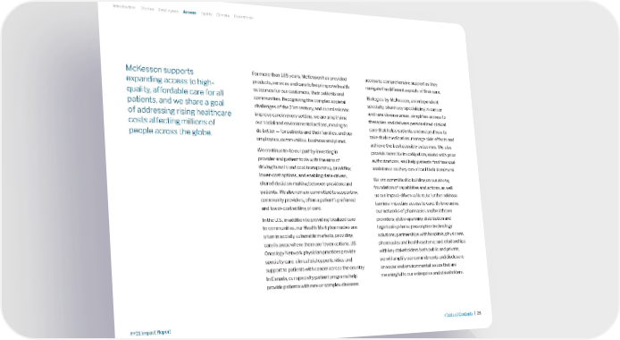 McKesson supports expanding access to high- quality, affordable care for all patients, and we share a goal of addressing rising healthcare costs affecting millions of people across the globe. For more than 185 years, McKesson has provided products, services and care to help improve health outcomes for our customers, their patients and communities. Recognizing the complex societal challenges of the 21st century, and our mission to improve care in every setting, we are amplifying our social and environmental actions, moving to do better — for patients and their families, and our employees, communities, business and planet. We continue to do our part by investing in provider and patient tools with the aims of driving benefit and cost transparency, providing lower-cost options, and enabling data-driven, shared decision-making between providers and patients. We also remain committed to supporting community providers, often a patient’s preferred and lower-cost setting of care. In the U.S., in addition to providing localized care to communities, our Health Mart pharmacies are often in socially vulnerable markets, providing care in areas where there are fewer options. US Oncology Network physician practices provide specialty care, clinical trial opportunities and support to patients with cancer across the country. In Canada, our specialty patient programs help provide patients with rare or complex diseases access to comprehensive support as they navigate the different aspects of their care. Biologics by McKesson, an independent specialty pharmacy specializing in cancer and rare disease areas, simplifies access to therapies and delivers personalized clinical care that helps patients understand how to take their medication, manage side effects and achieve the best possible outcomes. We also provide benefits investigation, assist with prior authorizations, and help patients find financial assistance so they can afford their treatment. We are committed to building on our strong foundation of capabilities and actions, as well as our impact-driven culture, to further address barriers impacting access to care. By leveraging our networks of pharmacies and healthcare providers; globe-spanning distribution and logistical systems; prescription technology solutions; partnerships with hospitals, physicians, pharmacies and health systems; and relationships with key stakeholders both public and private, we will amplify our commitments and disclosure on social and environmental issues that are meaningful to our enterprise and stakeholders. Introduction Stories Employees Access Equity Climate Operations >Table of Contents | 28 FY21 Impact Report