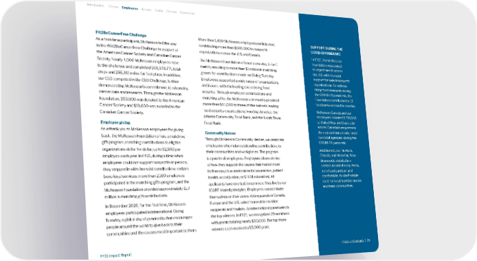 SUPPORT DURING THE COVID-19 PANDEMIC In FY21, the McKesson Foundation responded to urgent needs across the U.S. with financial support for select nonprofit organizations. To address rising food insecurity during the COVID-19 pandemic, the Foundation contributed to 13 food banks across the country. McKesson Canada and our employees donated $198,000 to United Way and Centraide across Canada in response to the extraordinary needs faced by social agencies during the COVID-19 pandemic. Additionally, our Trenton, Ontario, and Moncton, New Brunswick, distribution centers donated many items, from hand sanitizer and comfort kits, to shelf-stable food, for local frontline nurses and their communities. Fit2BeCancerFree Challenge As a first-time participant, McKesson led the way in the #Fit2BeCancerFree Challenge in support of the American Cancer Society and Canadian Cancer Society. Nearly 4,000 McKesson employees rose to the challenge and completed 565,578,771 total steps and 255,301 miles for first place. In addition, our CEO competed in the CEO Challenge, further demonstrating McKesson’s commitment to advancing cancer care and research. Through the McKesson Foundation, $50,000 was donated to the American Cancer Society and $10,000 was awarded to the Canadian Cancer Society. Employee giving As a thank you to McKesson employees for giving back, the McKesson Foundation offers a matching gift program, matching contributions to eligible organizations dollar for dollar, up to $2,500 per employee each year. In FY21, during a time when employees could not support nonprofits in person, they stepped in with financial contributions and pro bono legal services: more than 2,100 employees participated in the matching gifts program, and the McKesson Foundation provided approximately $1.7 million in matching gift contributions. In December 2020, for the first time, McKesson employees participated in International Giving Tuesday, a global day of generosity that encourages people around the world to give back to their communities and the causes most important to them. More than 1,400 McKesson employees participated, contributing more than $600,000 to nonprofit organizations across the U.S. and Canada. The McKesson Foundation offered a one-day 2-for-1 match, resulting in more than $1 million in matching grants for contributions made on Giving Tuesday. Employees supported a wide range of organizations and issues, with the leading cause being food security. Through employee contributions and matching gifts, the McKesson community provided more than $61,000 to three of the nation's leading food security organizations: Feeding America, the Atlanta Community Food Bank, and the North Texas Food Bank. Community Heroes Through McKesson Community Heroes, we celebrate employees who make outstanding contributions to their communities and workplaces. The program is open to all employees. Employees share stories of how they support the causes that matter most to them (such as environmental awareness, patient health, social justice, or STEM education). All applicants have one trait in common: They live by our ICARE shared principles. Employees can nominate themselves or their peers. Voting panels in Canada, Europe and the U.S. select honorable mention recipients and finalists. An international panel selects the top winners. In FY21, we recognized 29 nominees with grants totaling nearly $50,000. The top three winners each received a $5,000 grant. Introduction Stories Employees Access Equity Climate Operations >Table of Contents | 25 FY21 Impact Report