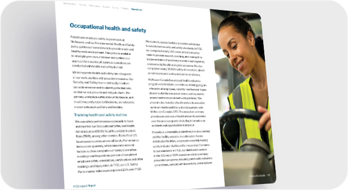 Occupational health and safety Patient and employee safety is paramount at McKesson, and our Environmental, Health and Safety policy guides our commitment to provide a safe and healthy work environment. This policy is available to all employees on our intranet and outlines our approach to ensuring all business operations are conducted with health and safety in mind. We incorporate health and safety into all aspects of our work, starting with proactive measures. Our Security and Safety team continually monitors our work environment to identify potential risks, so that we can prevent and mitigate them. The primary workplace safety risks at McKesson, and most frequently reported incidents, are related to movements such as lifting and bending. Tracking health and safety metrics We use safety performance scorecards to track and monitor our Occupational Safety and Health Administration (OSHA) Total Recordable Incident Rate (TRIR), among other metrics. Each of our U.S. businesses receives an overall Safety Performance Index score quarterly, which takes into account factors such as completion of Safety Committee meetings and inspections; percent of completed employee safety orientations, certifications and other trainings; and injury rates. In FY21, our U.S. Safety Performance Index score improved 2.1% over FY20. We routinely assess facilities to monitor adherence to established security and safety standards. In FY21, we completed nearly 100 onsite and virtual safety visits to provide support, coaching, and oversight for implementation of accident prevention and regulatory environmental health and safety programs. We also completed nearly 33,000 safety observations, aimed at reinforcing safe work practices for employees. McKesson Canada has a robust health and safety program which includes a continuous training program offered to all employees, monthly “set the tone” topics shared to distribution center teams, and ergonomic assessment to improve best work practices. The program also includes a health and safety executive summary dashboard that is shared quarterly with McKesson Canada’s CEO. The executive summary provides an overview of health and safety activities over the previous quarter, including information on accidents and opportunities to improve. If a serious vulnerability is identified, it is documented, and the facility prepares an action plan. Across distribution facilities, we prepare a monthly leading safety indicator dashboard to measure performance to our standards. In FY21, our distribution centers in the U.S. had a 100% execution rate in core injury prevention programs, including joint health and safety committees, periodic self-inspections, and employee Introduction Stories Employees Access Equity Climate Operations >Table of Contents | 68 FY21 Impact Report