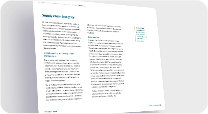 Supply chain integrity We endeavor to provide safe, high-quality products to our customers and their patients; a commitment that is guided by our company’s purpose and mission. Additionally, the suppliers of our internationally sourced private-label products must agree to the McKesson Supplier Sustainability Principles (MSSP), which cover compliance with applicable laws along with adherence to strict policies on protecting workers, preparing for emergencies, and protecting the environment. Global sourcing and supply chain management Our company-wide values are the foundation of McKesson’s approach to being a responsible corporation. As a trusted organization — one that goes the extra mile to advance our customers’ and business partners’ success — these values are also the foundation of McKesson’s approach to being a responsible steward of international supply chain management. Our Global Sourcing organization is responsible for identifying potential overseas suppliers for our private-label brands. Once suppliers are identified, we begin assessment and qualification processes to determine if these suppliers meet our criteria. Our Global Sourcing teams evaluate suppliers for adherence to Current Good Manufacturing Practices (CGMP) and other regulations, while our Responsible Sourcing teams evaluate supplier conformance to the MSSP. Global Sourcing To support our Global Sourcing program, we have employees in certain countries where our private-label products are manufactured by third party suppliers. These McKesson employees focus on product quality, supply chain and logistics, and sourcing; and perform product inspections and audits during factory visits. Suppliers must complete assessments and audits covering CGMP and our own responsible sourcing criteria, outlined in the MSSP in accordance with our protocols. Our Global Sourcing team may only procure items from suppliers after the supplier fulfills our standards and are added to our approved supplier list. Furthermore, new internationally sourced private-label products undergo product qualification processes, which can involve using benchmark products, developing inspection criteria and private- label artwork to help ensure compliance with brand guidelines and regulatory obligations. We have in-house licensed customs brokers for shipments bound for the U.S. that enable the importation of products into the U.S. Our company- wide values are the foundation of McKesson’s approach to being a responsible corporation. Introduction Stories Employees Access Equity Climate Operations >Table of Contents | 62 FY21 Impact Report