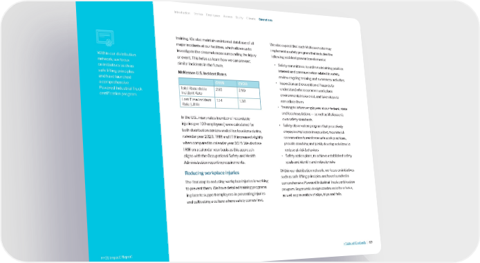 training. We also maintain an internal database of all major incidents at our facilities, which allows us to investigate the circumstances surrounding the injury or event. This helps us learn how we can prevent similar incidents in the future. McKesson U.S. Incident Rates CY19 CY20 Total Recordable Incident Rate 2.81 2.99 Lost-Time Incident Rate (LTIR) 1.14 1.30 In the U.S., injury rates (number of recordable injuries per 100 employees) were calculated for both distribution centers and office locations during calendar year 2020. TRIR and LTIR increased slightly when compared to calendar year 2019. We disclose TRIR on a calendar year basis as this approach aligns with the Occupational Safety and Health Administration reporting requirements. Reducing workplace injuries The first step to reducing workplace injuries is working to prevent them. We have detailed training programs in place to support employees in preventing injuries and cultivating a culture where safety comes first. We also expect that each McKesson site may implement a safety program that includes the following accident prevention elements: • Safety committees, to aid in maintaining positive interest and communication related to safety, review ongoing training and awareness activities • Inspection and recognition of hazards to understand where common workplace environmental risks exist, and take steps to remediate them • Training to inform employees about federal, state and local regulations — as well as McKesson’s own safety standards • Safety observation program that proactively engages employees in a positive, meaningful conversation to reinforce safe work practices, provide coaching and jointly develop solutions to reduce at-risk behaviors • Safety action plans, to achieve established safety goals and identify and mitigate risks Within our distribution network, we focus on initiatives such as safe lifting principles and have launched a comprehensive Powered Industrial Truck certification program. Ergonomic design continues to be a focus, as well as prevention of slips, trips and falls. Within our distribution network, we focus on initiatives such as safe lifting principles and have launched a comprehensive Powered Industrial Truck certification program. Introduction Stories Employees Access Equity Climate Operations >Table of Contents | 69 FY21 Impact Report FY21 Impact Report