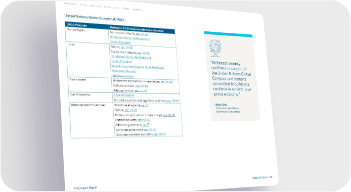 UNGC Principle McKesson FY21 response/disclosure location Human Rights Supply chain integrity, pgs. 62-65 UK Modern Slavery Act Statement Code of Conduct Labor Culture, pgs. 19-23 Supply chain integrity, pgs. 62-65 UK Modern Slavery Act Statement Code of Conduct Equal Employment Opportunity at McKesson Workplace Diversity McKesson Values Environment McKesson’s approach to climate change, pgs. 39-43 Addressing waste, pgs. 44-46 Addressing water use, pg. 47 Anti-Corruption Code of Conduct Compliance, ethics and regulatory excellence, pgs. 58-61 Measurement of Outcomes Workforce at a glance, pg. 17 Culture, pgs. 19-23 McKesson’s approach to climate change, pgs. 39-43 Addressing waste, pgs. 44-46 Addressing water use, pg. 47 Corporate governance, pgs. 52-55 Occupational health and safety, pgs. 68-70 United Nations Global Compact (UNGC) “McKesson proudly reaffirms its support of the United Nations Global Compact and remains committed to building a sustainable and inclusive global economy.” – Brian Tyler Chief Executive Officer, McKesson Corporation Introduction Stories Employees Access Equity Climate Operations >Table of Contents | 81 FY21 Impact Report