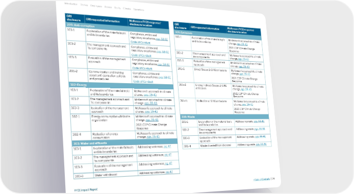 GRI disclosure GRI requested information McKesson FY21 response/ disclosure location 205: Anti-corruption 103-1 Explanation of the material topic and its boundaries Compliance, ethics and regulatory excellence, pgs. 58-61 Code of Conduct 103-2 The management approach and its components Compliance, ethics and regulatory excellence, pgs. 58-61 Code of Conduct 103-3 Evaluation of the management approach Compliance, ethics and regulatory excellence, pgs. 58-61 Code of Conduct 205-2 Communication and training about anti-corruption policies and procedures Compliance, ethics and regulatory excellence, pgs. 58-61 Code of Conduct 302: Energy 103-1 Explanation of the material topic and its boundaries McKesson’s approach to climate change, pgs. 39-43 103-2 The management approach and its components McKesson’s approach to climate change, pgs. 39-43 103-3 Evaluation of the management approach McKesson’s approach to climate change, pgs. 39-43 302-1 Energy consumption within the organization McKesson’s approach to climate change, pgs. 39-43 2021 CDP Climate Change Response 302-4 Reduction of energy consumption McKesson’s approach to climate change, pgs. 39-43 303: Water and effluents 103-1 Explanation of the material topic and its boundaries Addressing water use, pg. 47 103-2 The management approach and its components Addressing water use, pg. 47 103-3 Evaluation of the management approach Addressing water use, pg. 47 303-3 Water withdrawal Addressing water use, pg. 47 GRI disclosure GRI requested information McKesson FY21 response/ disclosure location 305: Emissions 103-1 Explanation of the material topic and its boundaries McKesson’s approach to climate change, pgs. 39-43 2021 CDP Climate Change Response 103-2 The management approach and its components McKesson’s approach to climate change, pgs. 39-43 103-3 Evaluation of the management approach McKesson’s approach to climate change, pgs. 39-43 305-1 Direct (Scope 1) GHG emissions McKesson’s approach to climate change, pgs. 39-43 2021 CDP Climate Change Response 305-2 Energy indirect (Scope 2) GHG emissions McKesson’s approach to climate change, pgs. 39-43 2021 CDP Climate Change Response 305-5 Reduction of GHG emissions McKesson’s approach to climate change, pgs. 39-43 2021 CDP Climate Change Response 306: Waste 103-1 Explanation of the material topic and its boundaries Addressing waste, pgs. 44-46 103-2 The management approach and its components Addressing waste, pgs. 44-46 103-3 Evaluation of the management approach Addressing waste, pgs. 44-46 306-4 Waste diverted from disposal Addressing waste, pgs. 44-46 Introduction Stories Employees Access Equity Climate Operations >Table of Contents | 74 FY21 Impact Report