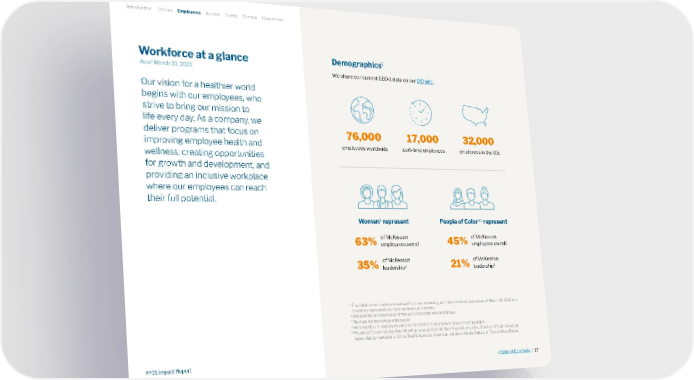 Workforce at a glance As of March 31, 2021 Demographics 1 We share our current EEO-1 data on our DEI site . Introduction Stories Employees Access Equity Climate Operations Our vision for a healthier world begins with our employees, who strive to bring our mission to life every day. As a company, we deliver programs that focus on improving employee health and wellness, creating opportunities for growth and development, and providing an inclusive workplace where our employees can reach their full potential. 76,000 employees worldwide 17,000 part-time employees 32,000 employees in the U.S. Women 3 represent 63% of McKesson employees overall 35% of McKesson leadership 2 People of Color 4,5 represent 45% of McKesson employees overall 21% of McKesson leadership 2 1 The data for our metrics is derived from our voluntary, self-identification process as of March 31, 2021 and therefore represents our best estimate at this time. 2 Represents our leadership at the vice president level and above. 3 Represents worldwide employees. 4 Represents U.S. employees only as the data for Canada and Europe is not available. 5 People of Color includes the following races and ethnicities: Hispanic or Latino, Black or African American, Asian, Native Hawaiian or Other Pacific Islander, American Indian or Alaska Native, or Two or More Races. >Table of Contents | 17 FY21 Impact Report
