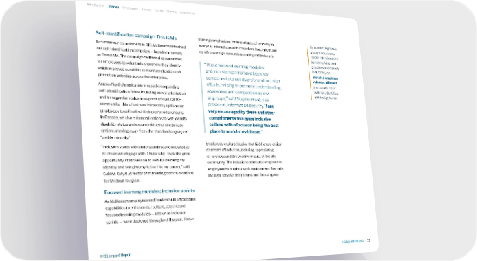 Self-identification campaign: This Is Me To further our commitment to DEI, McKesson refreshed our self-identification campaign — branded internally as This is Me . The campaign facilitated opportunities for employees to voluntarily share how they identify, which improved our ability to monitor retention and promotion activities across the enterprise. Across North America, we focused on expanding self-identification fields, including sexual orientation and transgender status, in support of our LGBTQ+ community. This effort was followed by options for employees to self-select their preferred pronouns. In Canada, we also enhanced options to self-identify disability status and expanded the list of ethnicity options, moving away from the standard language of “visible minority.” “Inclusion starts with understanding and knowledge of those we engage with. That’s why I took the great opportunity at McKesson to self-ID, claiming my identity and bringing my full self to my career,” said Sabina Katyal, director of marketing communications for Medical-Surgical. Focused learning modules: inclusion sprints As McKesson employees and leaders built on personal capabilities to enhance our culture, specific and focused learning modules — known as inclusion sprints — were deployed throughout the year. These trainings emphasized the importance of empathy in everyday interactions with coworkers that, in turn, set a path toward greater understanding and inclusion. “These focused learning modules and inclusion sprints have been key components to our diversity and inclusion efforts, helping to promote understanding, awareness and compassion across all groups,” said Stephen Ford, vice president, information security. “ I am very encouraged by these and other commitments to a more inclusive culture with a focus on being the best place to work in healthcare .” Employees explored topics that highlighted critical elements of inclusion, including appreciating differences and the positive impact of the ally community. The inclusion sprints also empowered employees to create a work environment that sets the right tone for their teams and the company. By conducting focus group discussions, leader interviews and benchmarking best practices in different industries, we elevated employee voices at all levels and across many cultures, identities, and backgrounds. Introduction Stories Employees Access Equity Climate Operations >Table of Contents | 13 FY21 Impact Report