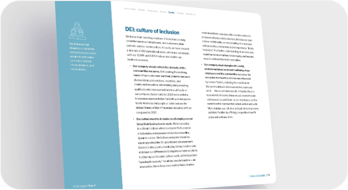 DEI: culture of inclusion We know that fostering a culture of inclusion can help us better serve our employees, our customers, their patients and our communities. As such, we have created a new set of DEI aspirational goals, which are consistent with our ICARE and ILEAD values and vital to our business success. • Our company should reflect the diversity of the communities we serve. Anticipating the evolving needs of our customers and their patients demands diverse ideas, perspectives, expertise, and continued innovation. We’re hiring and promoting qualified underrepresented talent at all levels of our company. Specifically, by 2025 we're striving to increase representation for both women (across North America) and people of color (across the United States) at the VP level and above by 20% as compared to 2021. • Our culture must be inclusive so all employees can bring their best selves to work. We’re investing in a vibrant culture where everyone feels a sense of belonging and a passion to build a rewarding, dynamic career. We believe everyone deserves equal opportunities for growth and advancement. Central to this goal is developing strong leaders who embrace our differences to inspire our best solutions. Furthering our broader culture work, we’ve launched “Leading Inclusively” for all our people leaders — an interactive, three-hour session that helps leaders understand their unique position as role models for inclusive behavior and tactics to build inclusive team culture. Additionally, we are providing all employees with a one-hour online interactive experience, “Ignite Inclusion,” that builds understanding about inclusion, identifies tactics that lead to belonging, and teaches ways to address bias in the workplace. • Our company must champion the social, environmental and economic wellbeing of our employees and the communities we serve. We recognize that health outcomes are influenced by several factors, including the conditions in the communities in which people live, learn and work — the social determinants of health. We aim to positively influence these social, environmental and economic conditions for our employees, and by extension the communities where we live and work. We’re helping our full-time and part-time employees and their families by offering competitive benefit plans and wellness tools. We believe that diversity of all kinds and an inclusive work environment make us more resilient, more creative, and more aware. Introduction Stories Employees Access Equity Climate Operations >Table of Contents | 34 FY21 Impact Report FY21 Impact Report