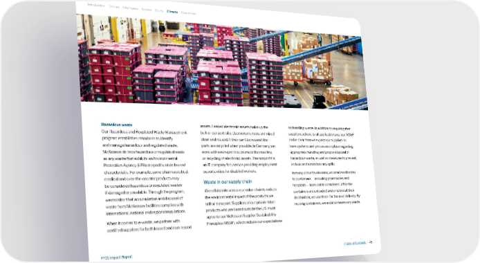 Hazardous waste Our Hazardous and Regulated Waste Management program establishes standards to identify and manage hazardous and regulated waste. McKesson defines hazardous or regulated waste as any waste that exhibits an Environmental Protection Agency (EPA) or specific state hazard characteristic. For example, some pharmaceutical, medical and over-the-counter products may be considered hazardous or regulated wastes if damaged or unsalable. Through the program, we monitor that accumulation and disposal of waste from McKesson facilities complies with international, national and regional regulations. When it comes to e-waste, we partner with certified suppliers for both leased and non-leased assets. Leased electronic assets make up the bulk of our portfolio. Upon return, many are wiped clean and reused. If they can’t be reused, the parts are recycled when possible. In Germany, we work with a non-profit to promote the reselling or recycling of electronic assets. The nonprofit is an IT company focused on providing employment opportunities for disabled workers. Waste in our supply chain We collaborate across our value chain to reduce the environmental impact of the products we sell or transport. Suppliers of our private-label products who are based outside the U.S. must agree to our McKesson Supplier Sustainability Principles (MSSP), which include our expectations on handling waste. In addition to requiring that suppliers adhere to all applicable laws, our MSSP make clear that we expect our suppliers to have systems and processes in place regarding appropriate handling and proper disposal of hazardous waste, as well as measures to prevent, reduce and remediate any spills. In many of our businesses, we send medication to customers — including pharmacies and hospitals — in reusable containers. After the containers are unloaded and emptied at their destination, we use them for the next delivery. By reusing containers, we avoid unnecessary waste. Introduction Stories Employees Access Equity Climate Operations >Table of Contents | 45 FY21 Impact Report