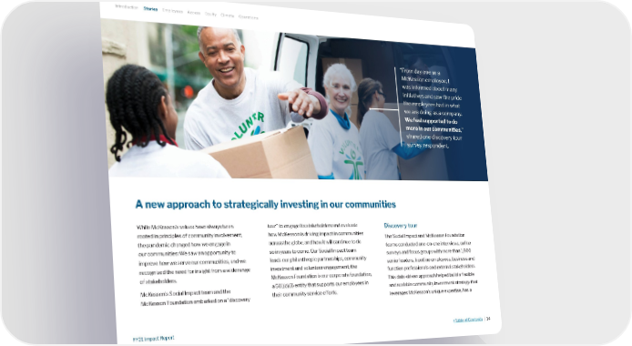 A new approach to strategically investing in our communities While McKesson’s values have always been rooted in principles of community involvement, the pandemic changed how we engage in our communities: We saw an opportunity to improve how we serve our communities, and we recognized the need for insight from a wide range of stakeholders. McKesson’s Social Impact team and the McKesson Foundation embarked on a “discovery tour” to engage its stakeholders and evaluate how McKesson is driving impact in communities across the globe, and how it will continue to do so in years to come. Our Social Impact team leads our philanthropic partnerships, community investment and volunteer engagement; the McKesson Foundation is our corporate foundation, a 501(c) (3) entity that supports our employees in their community service efforts. Discovery tour The Social Impact and McKesson Foundation teams conducted one-on-one interviews, online surveys and focus groups with more than 1,600 senior leaders, frontline employees, business and function professionals and external stakeholders. This data-driven approach helped build a flexible and scalable community investment strategy that leverages McKesson’s unique expertise, has a A new approach to strategically investing in our communities “From day one as a McKesson employee, I was informed about many initiatives and saw the pride the employees had in what we are doing as a company. We feel supported to do more in our communities ,” shared one discovery tour survey respondent. Introduction Stories Employees Access Equity Climate Operations >Table of Contents | 14 FY21 Impact Report