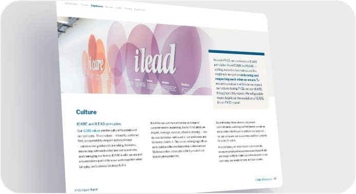Culture ICARE and ILEAD principles Our ICARE values are the cultural foundation of our company. These values — integrity, customer- first, accountability, respect and excellence — serve as our guideposts in making decisions, interacting with each other and our customers, and managing our teams. ICARE is who we are and a foundational part of how we work together when bringing our business strategy to life. ILEAD is our common definition and shared commitment to leadership. Each ILEAD attribute — inspire, leverage, execute, advance, develop — has its own definition, with a set of competencies and behaviors tied to it. This common language allows us to build a collective leadership culture across McKesson that is brought to life by each of our individual experiences. By embracing these shared values and commitments, we bring out the best in ourselves and position McKesson to achieve our purpose — for our company, our customers and their patients for years to come. As a company, we work to use our economic, environmental and social resources thoughtfully and responsibly to make a positive impact on our company, our environment, and our society. In early FY22, we evolved our ICARE principles from ICARE to I 2 CARE — adding inclusion to underscore the emphasis we put on embracing and respecting each other as we are . To remain consistent with how we stated our values during FY21, we use ICARE throughout this report. We will provide more details on the evolution of ICARE in our FY22 report. Introduction Stories Employees Access Equity Climate Operations >Table of Contents | 19 FY21 Impact Report