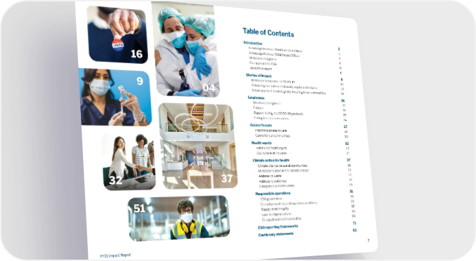 Table of Contents 16 04 9 Introduction 3 A message from our Chief Executive Officer 3 A message from our Chief Impact Officer 4 McKesson at a glance 6 Our approach to ESG 8 About this report 8 Stories of impact 9 McKesson's response to COVID-19 10 Enhancing our culture of diversity, equity and inclusion 12 A new approach to strategically investing in our communities 14 Employees 16 Workforce at a glance 17 Culture 19 Support during the COVID-19 pandemic 22 Caring for our communities 24 Access to care 27 Improving access to care 29 Caring for our communities 30 Health equity 32 Advancing health equity 33 DEI: culture of inclusion 34 Climate action for health 37 Climate change: risks and opportunities 38 McKesson's approach to climate change 39 Addressing waste 44 Addressing water use 47 Caring for our communities 48 Responsible operations 51 ESG governance 56 Compliance, ethics and regulatory excellence 58 Supply chain integrity 62 Lean Six Sigma culture 66 Occupational health and safety 68 ESG reporting frameworks 71 Cautionary statements 82 32 37 51 2 FY21 Impact Report