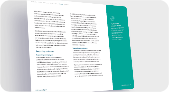 We can use mass notification systems to establish communication with employees who may be affected by a disaster and work to share important information that can help protect them and their families during an emergency or crisis. When there is advance warning of a disaster, McKesson takes immediate preparatory measures, such as ordering extra fuel for generators and planning alternate delivery routes in case of highway and road closures. We may move inventory from one location to another or deploy additional personnel to assist with post-crisis activities, including additional customer orders. Based on our experience supporting natural disaster preparedness and recovery efforts, we position extra inventory of medications and supplies that are frequently needed following an event. Examples include insulin for diabetics, dialysis supplies, vaccines for first-responders, antibiotics for viral outbreaks and anti-venom for snakebites as snakes are prevalent following flood conditions. Responding to disasters Supporting our employees The safety and security of our employees is paramount. When disaster strikes, we activate established policies and procedures to help ensure our employees’ safety in the case of an emergency. For example, we can use mass notification systems to establish communication with employees who may be affected by a disaster and work to share important information that can help protect them and their families during the emergency or crisis. In addition to alerting employees and supporting them during a disaster, we also provide assistance for employees to help manage the disaster’s impact. The McKesson Taking Care of Our Own Fund, administered by the Emergency Assistance Foundation, provides cash grants for employees experiencing personal hardship or the effects of a qualified disaster. In FY21, the Fund distributed 628 hardship grants totaling more than $1.3 million, including 34 grants to cover expenses related to natural disasters. Additionally, when a major disaster necessitates evacuation, employees can request immediate response grants, called Get You to Safety grants, to cover the expenses incurred due to a mandatory evacuation. Supporting our customers Catastrophic events such as hurricanes, wildfires and blizzards can quickly overwhelm recovery efforts by shutting down access to, and within, entire towns. Extreme weather disrupts livelihoods and prevents people from receiving critical goods and services — including medical supplies and pharmaceuticals. Working to maintain a seamless supply chain process and continued delivery of essential supplies is a top priority at McKesson. Our team has decades of experience in planning ahead to maintain an uninterrupted supply chain once a disaster hits, and we are also prepared to quickly shift operations in real Introduction Stories Employees Access Equity Climate Operations >Table of Contents | 49 FY21 Impact Report