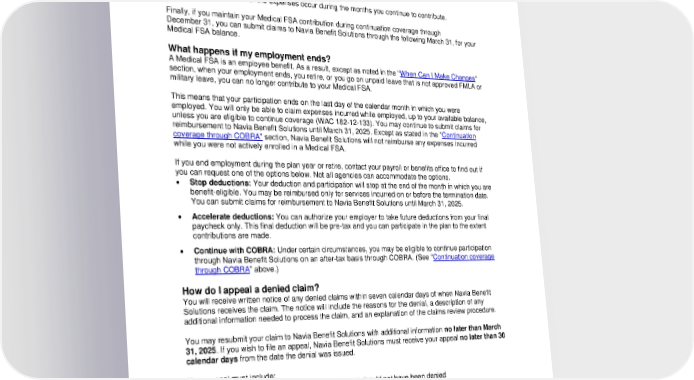 you do not make a payment on time, you may submit claims only for expenses incurred through your last active month of paid participation. You also cannot receive reimbursement from your Medical FSA if the date of service for the expense is during an unpaid work period when eligibility is lost. For example, if you lose eligibility beginning July 1, you can only receive reimbursements for the rest of the plan year if: • You continue making contributions directly to Navia Benefit Solutions during the months of July through December, and • The dates of service for the expenses occur during the months you continue to contribute. Finally, if you maintain your Medical FSA contribution during continuation coverage through December 31, you can submit claims to Navia Benefit Solutions through the following March 31, for your Medical FSA balance. What happens if my employment ends? A Medical FSA is an employee benefit. As a result, except as noted in the “When Can I Make Changes“ section, when your employment ends, you retire, or you go on unpaid leave that is not approved FMLA or military leave, you can no longer contribute to your Medical FSA. This means that your participation ends on the last day of the calendar month in which you were employed. You will only be able to claim expenses incurred while employed, up to your available balance, unless you are eligible to continue coverage (WAC 182-12-133). You may continue to submit claims for reimbursement to Navia Benefit Solutions until March 31, 2025. Except as stated in the “Continuation coverage through COBRA” section, Navia Benefit Solutions will not reimburse any expenses incurred while you were not actively enrolled in a Medical FSA. If you end employment during the plan year or retire, contact your payroll or benefits office to find out if you can request one of the options below. Not all agencies can accommodate the options. • Stop deductions: Your deduction and participation will stop at the end of the month in which you are benefit-eligible. You may be reimbursed only for services incurred on or before the termination date. You can submit claims for reimbursement to Navia Benefit Solutions until March 31, 2025. • Accelerate deductions: You can authorize your employer to take future deductions from your final paycheck only. This final deduction will be pre-tax and you can participate in the plan to the extent contributions are made. • Continue with COBRA: Under certain circumstances, you may be eligible to continue participation through Navia Benefit Solutions on an after-tax basis through COBRA. (See “Continuation coverage through COBRA” above.) How do I appeal a denied claim? You will receive written notice of any denied claims within seven calendar days of when Navia Benefit Solutions receives the claim. The notice will include the reasons for the denial, a description of any additional information needed to process the claim, and an explanation of the claims review procedure. You may resubmit your claim to Navia Benefit Solutions with additional information no later than March 31, 2025. If you wish to file an appeal, Navia Benefit Solutions must receive your appeal no later than 30 calendar days from the date the denial was issued. Your appeal must include: • A statement outlining why you think your request should not have been denied • Your employer’s name • The dates of the services denied • A copy of your original claim • A copy of the denial letter you received 13