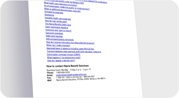 Table of Contents Who is eligible? How can a Medical Flexible Spending Arrangement (FSA) help me? How does the Medical FSA work? When can I enroll and how do I do it? When does my coverage begin? What if I’m a represented employee eligible for a $250 Medical FSA contribution? Whose expenses qualify under the Medical FSA? What health care expenses are eligible? Do all prescription medicines qualify for reimbursement? When is additional documentation required? Orthodontia expenses Stockpiling Ineligible health care expenses How do I get reimbursed? The Navia Benefits Debit Card Claim submission deadline Carryover and “use it or lose it” Carryover examples Debit card requests IIAS and participating merchants How do I receive information from Navia Benefit Solutions? When can I make changes? Approved leave of absence (including Leave Without Pay) Transfers between state agencies and higher-education institutions Continuation coverage through COBRA What happens if my employment ends? How do I appeal a denied claim? How to contact Navia Benefit Solutions Business hours: Monday – Friday, 5 a.m. – 5 p.m. PT Phone: 1-800-669-3539 Email: [email protected] Fax: 1-425-451-7002 or toll-free fax 1-866-535-9227 Mail: Navia Benefit Solutions, PO Box 53250, Bellevue, WA 98015 2