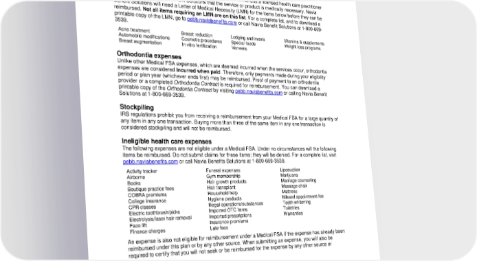 Do all prescription medicines qualify for reimbursement? Generally, yes, as long as they are prescribed by a physician and are legal under federal and state laws. However, prescriptions that are purchased solely for cosmetic purposes and that don’t treat an existing medical condition do not qualify. When is additional documentation required? Certain expenses are not reimbursable under a Medical FSA unless a licensed health care practitioner states in writing to Navia Benefit Solutions that the service or product is medically necessary. Navia Benefit Solutions will need a Letter of Medical Necessity (LMN) for the items below before they can be reimbursed. Not all items requiring an LMN are on this list. For a complete list, and to download a printable copy of the LMN, go to pebb.naviabenefits.com or call Navia Benefit Solutions at 1-800-669- 3539. Acne treatment Breast reduction Lodging and meals Vitamins & supplements Automobile modifications Cosmetic procedures Special foods Weight loss programs Breast augmentation In vitro fertilization Veneers Orthodontia expenses Unlike other Medical FSA expenses, which are deemed incurred when the services occur, orthodontia expenses are considered incurred when paid. Therefore, only payments made during your eligibility period or plan year (whichever ends first) may be reimbursed. Proof of payment to an orthodontia provider or a completed Orthodontia Contract is required for reimbursement. You can download a printable copy of the Orthodontia Contract by visiting pebb.naviabenefits.com or calling Navia Benefit Solutions at 1-800-669-3539. Stockpiling IRS regulations prohibit you from receiving a reimbursement from your Medical FSA for a large quantity of any item in any one transaction. Buying more than three of the same item in any one transaction is considered stockpiling and will not be reimbursed. Ineligible health care expenses The following expenses are not eligible under a Medical FSA. Under no circumstances will the following items be reimbursed. Do not submit claims for these items; they will be denied. For a complete list, visit pebb.naviabenefits.com or call Navia Benefits Solutions at 1-800-669-3539. Activity tracker Funeral expenses Liposuction Airborne Gym membership Marijuana Books Hair growth products Marriage counseling Boutique practice fees Hair transplant Massage chair COBRA premiums Household help Mattress College insurance Hygiene products Missed appointment fee CPR classes Illegal operations/substances Teeth whitening Electric toothbrush/picks Imported OTC items Toiletries Electrolysis/laser hair removal Imported prescriptions Warranties Face lift Insurance premiums Finance charges Late fees An expense is also not eligible for reimbursement under a Medical FSA if the expense has already been reimbursed under this plan or by any other source. When submitting an expense, you will also be required to certify that you will not seek or be reimbursed for the expense by any other source or insurance. How do I get reimbursed? Navia Benefit Solutions will send you a claim form when you enroll in the Medical FSA. Submit your claim and documentation to Navia Benefit Solutions for reimbursement. The documentation must show the: • Provider’s name • Name of the person receiving the service or expense 6