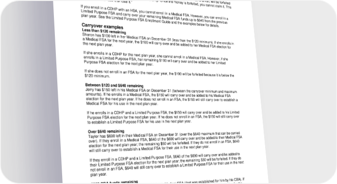 Carryover allows you to keep some funds for the next plan year. The maximum contribution limit is set by the IRS, and the amount is usually announced in late fall after HCA's annual open enrollment begins. Due to the timing of the IRS announcement, HCA adopts the increased maximum contribution limit for the following plan year. The maximum carryover amount is at least $640. (Because of the timing of IRS updates, this amount may increase slightly during the plan year. It will not decrease.) To receive carryover, you must enroll in an FSA for the next plan year, or have at least $120 left in your account on December 31. Any amount above $640, or below $120 if you do not re-enroll, will be forfeited to the plan administrator, the Health Care Authority. Once the money is forfeited, you cannot claim it. This is referred to as “use it or lose it.” If you enroll in a CDHP with an HSA, you cannot enroll in a Medical FSA. However, you can enroll in a Limited Purpose FSA and carry over your remaining Medical FSA funds up to $640 from the previous plan year. See the Limited Purpose FSA Enrollment Guide and the examples below for details. Carryover examples Less than $120 remaining Sharon has $100 left in her Medical FSA on December 31 (less than the $120 minimum). If she enrolls in a Medical FSA for the next year, the $100 will carry over and be added to her Medical FSA election for the next plan year. If she enrolls in a CDHP for the next plan year, she cannot enroll in a Medical FSA. However, if she enrolls in a Limited Purpose FSA, her remaining $100 will carry over and be added to her Limited Purpose FSA election for the next plan year. If she does not enroll in an FSA for the next plan year, the $100 will be forfeited because it is below the $120 minimum. Between $120 and $640 remaining Jerry has $150 left in his Medical FSA on December 31 (between the carryover minimum and maximum amounts). If he enrolls in a Medical FSA, the $150 will carry over and be added to his Medical FSA election for the next plan year. If he does not enroll in an FSA, the $150 will still carry over to establish a Medical FSA for his use in the next plan year. If he enrolls in a CDHP and a Limited Purpose FSA, the $150 will carry over and be added to his Limited Purpose FSA election for the next plan year. If he does not enroll in an FSA, the $150 will still carry over to establish a Limited Purpose FSA for his use in the next plan year. Over $640 remaining Taylor has $690 left in their Medical FSA on December 31 (over the $640 maximum that can be carried over). If they enroll in a Medical FSA, $640 of the $690 will carry over and be added to their Medical FSA election for the next plan year; the remaining $50 will be forfeited. If they do not enroll in an FSA, $640 will still carry over to establish a Medical FSA for their use in the next plan year. If they enroll in a CDHP and a Limited Purpose FSA, $640 of the $690 will carry over and be added to their Limited Purpose FSA election for the next plan year; the remaining $50 will be forfeited. If they do not enroll in an FSA, $640 will still carry over to establish a Limited Purpose FSA for their use in the next plan year. $250 CBA funds remaining On December 31, George has $250 left in his Medical FSA (that was established for him by his CBA). If he enrolls in a Medical FSA, the $250 will carry over and be added to his Medical FSA election for the next plan year. If he does not enroll in an FSA, the $250 will still carry over to establish a Medical FSA for his use in the next plan year. 8
