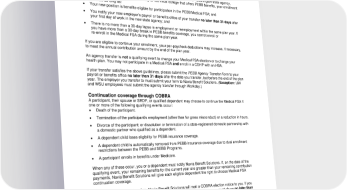 claims incurred during that month can be submitted for reimbursement. Future contributions should be recalculated to ensure they meet your annual election total by the end of the plan year. If you are ineligible for benefits while on leave, you will not be able to claim services incurred during your leave of absence. Transfers between state agencies and higher-education institutions If you enroll in a Medical FSA and later change jobs and move to another Washington state agency, higher-education institution, or community or technical college that offers PEBB benefits, your enrollment will continue as long as: • Your new position is benefits-eligible for participation in the PEBB Medical FSA; and • You notify your new employer’s payroll or benefits office of your transfer no later than 31 days after your first day of work in the new state agency; and • There is no more than a 30-day lapse in employment or reemployment within the same plan year. If you have more than a 30-day break in PEBB benefits coverage, you cannot enroll or re-enroll in the Medical FSA during the same plan year. If you are eligible to continue your enrollment, your per-paycheck deductions may increase, if necessary, to meet the annual contribution amount by the end of the plan year. An agency transfer is not a qualifying event to change your Medical FSA election or to change your health plan. You may not participate in a Medical FSA and enroll in a CDHP with an HSA. If your transfer satisfies the above guidelines, please submit the PEBB Agency Transfer Form to your payroll or benefits office no later than 31 days after the date you transfer, but before the end of the plan year. The employer you transfer to must submit your form to Navia Benefit Solutions. (Exception: UW and WSU employees must submit the agency transfer through Workday.) Continuation coverage through COBRA A participant, their spouse or SRDP, or qualified dependent may choose to continue the Medical FSA if one or more of the following qualifying events occur: • Death of the participant. • Termination of the participant’s employment (other than for gross misconduct) or a reduction in hours. • Divorce of the participant; or dissolution or termination of a state-registered domestic partnership with a domestic partner who qualified as a dependent. • A dependent child loses eligibility for PEBB insurance coverage. • A dependent child is automatically removed from PEBB insurance coverage due to dual enrollment restrictions between the PEBB and SEBB Programs. • A participant enrolls in benefits under Medicare. When any of these occur, you or a dependent must notify Navia Benefit Solutions. If, on the date of the qualifying event, your remaining benefits for the current year are greater than your remaining contribution payments, Navia Benefit Solutions will give each eligible dependent the right to choose Medical FSA continuation coverage. If you are eligible for this option, Navia Benefit Solutions will mail a COBRA election notice to you. If you elect Medical FSA continuation coverage through Navia Benefit Solutions, you must do so no later than 60 days from the date the notice of continuation rights was mailed to you. You may continue participating in the Medical FSA by making post-tax contributions directly to Navia Benefit Solutions for the rest of the plan year. Participation in the Medical FSA would continue through December 31, or until you stop making the monthly contribution on the predetermined payment date. If 12