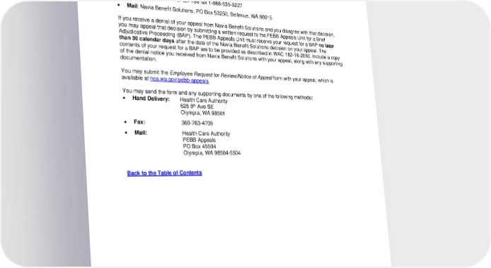 • Any additional documents or information that supports your appeal Navia Benefit Solutions will send you a written notice of the resolution of your appeal within 30 calendar days. Appeals are approved only if the extenuating circumstances and supporting documentation are within IRS regulations and the document that governs the PEBB Medical FSAs. To file a first-level appeal with Navia Benefit Solutions, use one of the methods below: • Email: [email protected] • Fax: 1-425-451-7002 or toll-free fax 1-866-535-9227 • Mail: Navia Benefit Solutions, PO Box 53250, Bellevue, WA 98015 If you receive a denial of your appeal from Navia Benefit Solutions and you disagree with that decision, you may appeal that decision by submitting a written request to the PEBB Appeals Unit for a Brief Adjudicative Proceeding (BAP). The PEBB Appeals Unit must receive your request for a BAP no later than 30 calendar days after the date of the Navia Benefit Solutions decision on your appeal. The contents of your request for a BAP are to be provided as described in WAC 182-16-2050. Include a copy of the denial notice you received from Navia Benefit Solutions with your appeal, along with any supporting documentation. You may submit the Employee Request for Review/Notice of Appeal form with your appeal, which is available at hca.wa.gov/pebb-appeals. You may send the form and any supporting documents by one of the following methods: • Hand Delivery: Health Care Authority th 626 8 Ave SE Olympia, WA 98501 • Fax: 360-763-4709 • Mail: Health Care Authority PEBB Appeals PO Box 45504 Olympia, WA 98504-5504 Back to the Table of Contents 14