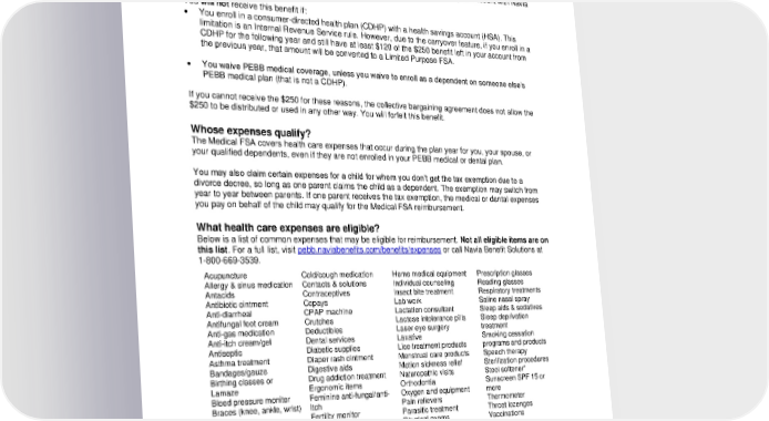 the debit card you received previously. If you did not receive this benefit previously, Navia will send you a debit card loaded with $250. Use the debit card for eligible health care expenses by December 31, 2024. If you enroll in an FSA for 2025, or have at least $120 left in your account on December 31, 2024, the funds will carry over into the next year. If you have less than $120 left in your account, and you do not enroll in an FSA for the next plan year, the funds will be forfeited after December 31, 2024. See the “Carryover and use it or lose it” section for details. • If you enroll in a Medical FSA for 2024, the $250 contribution will be added to your account with Navia Benefit Solutions in by February 1, 2024. You will not receive this benefit if: • You enroll in a consumer-directed health plan (CDHP) with a health savings account (HSA). This limitation is an Internal Revenue Service rule. However, due to the carryover feature, if you enroll in a CDHP for the following year and still have at least $120 of the $250 benefit left in your account from the previous year, that amount will be converted to a Limited Purpose FSA. • You waive PEBB medical coverage, unless you waive to enroll as a dependent on someone else’s PEBB medical plan (that is not a CDHP). If you cannot receive the $250 for these reasons, the collective bargaining agreement does not allow the $250 to be distributed or used in any other way. You will forfeit this benefit. Whose expenses qualify? The Medical FSA covers health care expenses that occur during the plan year for you, your spouse, or your qualified dependents, even if they are not enrolled in your PEBB medical or dental plan. You may also claim certain expenses for a child for whom you don’t get the tax exemption due to a divorce decree, so long as one parent claims the child as a dependent. The exemption may switch from year to year between parents. If one parent receives the tax exemption, the medical or dental expenses you pay on behalf of the child may qualify for the Medical FSA reimbursement. What health care expenses are eligible? Below is a list of common expenses that may be eligible for reimbursement. Not all eligible items are on this list. For a full list, visit pebb.naviabenefits.com/benefits/expenses or call Navia Benefit Solutions at 1-800-669-3539. Acupuncture Cold/cough medication Home medical equipment Prescription glasses Allergy & sinus medication Contacts & solutions Individual counseling Reading glasses Antacids Contraceptives Insect bite treatment Respiratory treatments Antibiotic ointment Copays Lab work Saline nasal spray Anti-diarrheal CPAP machine Lactation consultant Sleep aids & sedatives Antifungal foot cream Crutches Lactose intolerance pills Sleep deprivation Anti-gas medication Deductibles Laser eye surgery treatment Anti-itch cream/gel Dental services Laxative Smoking cessation Antiseptic Diabetic supplies Lice treatment products programs and products Asthma treatment Diaper rash ointment Menstrual care products Speech therapy Bandages/gauze Digestive aids Motion sickness relief Sterilization procedures Birthing classes or Drug addiction treatment Naturopathic visits Stool softener* Lamaze Ergonomic items Orthodontia Sunscreen SPF 15 or Blood pressure monitor Feminine anti-fungal/anti- Oxygen and equipment more Braces (knee, ankle, wrist) itch Pain relievers Thermometer Breast pump Fertility monitor Parasitic treatment Throat lozenges Braille books Fertility treatment Physical exams Vaccinations Burn cream Flu shots Physical therapy Vision care Chiropractic services Hearing aids & supplies Pregnancy test Walker Coinsurance Hemorrhoid medication Prenatal vitamins Wart treatment Cold sore treatment Prescription drugs Wheelchair & repair 5