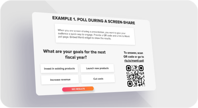 EXAMPLE 1. POLL DURING A SCREEN-SHARE When you are screen-sharing a presentation, you want to give your audience a quick way to engage. Provide a QR code and a link to Menti poll page. Embed Menti widget to show the results. To answer, scan What are your goals for the next QR code or go to fiscal year? rla.to/menti-poll Invest in existing products Launch new products Increase revenue Cut costs SEE RESULTS