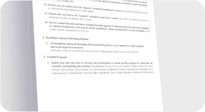 10. Any unique maintenance content for AMG and V12 vehicles is specified in the corresponding Service Sheets and must be advertised accordingly 11. All customer-facing communication and documentation regarding services must list all factory-required services for Service A and Service B as well as identify any additional dealer-recommended services as above and beyond the stated requirements including but not limited to maintenance reminders, online scheduling, vehicle repair orders, etc. 12. Dealers may not remove from the “required” scheduled maintenance content and market the diminished service as sufÏcient for proper maintenance of the vehicle. 13. Dealers may not add to the “required” scheduled maintenance content and market the additional services as required for proper maintenance of the vehicle. 14 Service content that does not have a technical benefit supported by Mercedes-Benz USA may not be marketed as required maintenance and must be clearly identified as “dealer-recommended” services including all fuel system cleaners, nitrogen tire services, etc. E. TouchPoint Advanced Marketing Platform 1. All TouchPoint Advanced Marketing Platform marketing pieces are pre-approved as brand compliant and no pre-approval is required. These pieces will not be monitored by Mercedes-Benz Communication Consultation Services (MBCCS). F. Certified Programs 1. Dealers may only advertise or reference their participation in certain specific programs for which they are currently participating and certified. Such programs include, but are not limited to, Premier Express, My Choice, PartsPro and Certified Collision Centers. Any advertisements or references by dealers regarding their participation in any such programs in violation of this provision will be considered a “strike” against the dealer, as referenced further herein. Published August 2015, Rev. 10 Mercedes-Benz Brand Communication Standards l Page 27