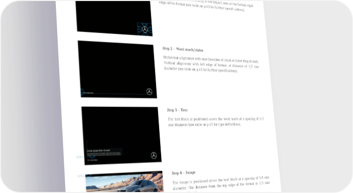 B. 4 Steps to an Advertisement Step 1 – Star The star is positioned according to the impact area at the bottom right edge of the format (see table on p.43 for further specifi cations). Step 2 – Word mark/claim Horizontal alignment with star (baseline of claim at inner ring of star). Vertical alignment with left edge of format, at distance of 1/2 star diameter (see table on p.43 for further specifications). Step 3 – Text The text block is positioned above the word mark at a spacing of 1/3 star diameter (see table on p.45 for type definitions). 1/3 x 1/3 x Step 4 – Image The image is positioned above the text block at a spacing of 1/4 star diameter. The distance from the top edge of the format is 1/3 star diameter (fixed). 1/4 x x = star diameter Published August 2015, Rev. 10 Mercedes-Benz Brand Communication Standards l Page 41