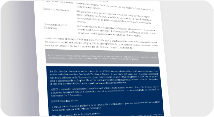MBUSA New Vehicle Tier 3 Bonus Program Category II Infraction Policy Overview: (Refer to RDA Program document, Rev. 7, February 2014 for full program details) Category II, 1st - 4th Infraction: No monetary assessment; Dealer will receive a Courtesy Notification Letter, dealer placed on rolling six-month probation. Category II, 5th Infraction: 50% assessment at $445 per wholesale of the MBUSA New Vehicle Tier 3 Bonus Program monies paid for the month in which the infraction occurred via the “Miscellaneous Billing System”; dealer placed on six-month probation based on the date in which the infraction occurred. Subsequent Category II Notifications within the six-month probation period equate to a 50% assessment at $445 per wholesale Notifications: from the month in which the Category II infraction occurred. In addition, the six-month probation period resets based on the date in which the subsequent infraction occurred. Dealers are cleared of probation if they have placed Tier 3, Category II brand compliant communications in the marketplace for six consecutive months after their last Category II Notification infraction date, i.e., an infraction occurring more than six months from the last Category II Notification infraction date will be reset as Category II Notification #1. Note: A communication containing multiple infractions will be counted as one strike. A communication containing both a Category I and Category II infraction will default to a strike pertaining to the most egregious infraction, i.e., Category I infraction supercedes a Category II infraction. The Mercedes-Benz Communication Consultation Service (MBCCS) has been established for consulting and monitoring services relative to the Mercedes‑Benz New Vehicle Tier 3 Bonus Program. All new vehicle and service Tier 3 marketing questions not specifically addressed in the “Mercedes-Benz Brand Communication Standards” must be submitted to MBCCS for pre-approval prior to placement in the marketplace. The service is available weekdays (excluding holidays) between 9 AM and 4 PM regardless of time zone at 1-800-790-0917, or via e-mail [email protected]. MBCCS is committed to respond to each consult request within 24 hours; however, review of a dealer’s Tier 3 website requires a seven-day turnaround. MBCCS is positioned to assist all Mercedes-Benz dealers in assuring eligibility for the Mercedes-Benz New Vehicle Tier 3 Bonus funds. MBCCS Consulting Service: 1. MBCCS Consult Approvals are binding for 60 days with the exception of Sales Operation’s monthly offers which are valid only for the month indicated in the “Monthly Sales Guide.” MBCCS is not responsible for the following services: 1. VIN and Stock #s: It is assumed that dealers in good faith are listing vehicles at MSRP to assure compliance to MBUSA’s Tier 3 Bonus Program. MSRP, by VIN, will be confirmed during MBCCS’s monitoring process only. 2. Superlative claims: Dealer is responsible to assure that claims can be documented. 3. Questions relative to AOI are to be directed to your Regional Marketing Manager. Published August 2015, Rev. 10 Mercedes-Benz Brand Communication Standards l Page 67