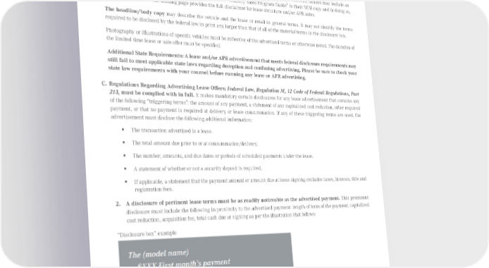 To ensure compliance with these federal legal requirements, pertinent lease or retail data must closely accompany the advertised payment or APR rate in a manner as conspicuous as the advertised payment or APR rate. A dealer must always check with their legal counsel to ensure all state and/or local regulations are also followed. ƒ To comply with “as conspicuous as” in digital banner and paid search marketing initiatives, dealers may include an MBUSA monthly offer as outlined in the current “Monthly Sales Program Guide” in their SEM copy and in doing so, must assure the landing page provides the full disclaimer for lease structure and/or APR rates. The headline/body copy may describe the vehicle and the lease or retail in general terms. It may not identify the terms required to be disclosed by the federal law in print any larger than that of all of the material terms in the disclosure box. Photography or illustrations of specific vehicles must be reflective of the advertised terms or otherwise noted. The duration of the limited time lease or sale offer must be specified. Additional State Requirements: A lease and/or APR advertisement that meets federal disclosure requirements may still fail to meet applicable state laws regarding deception and confusing advertising. Please be sure to check your state law requirements with your counsel before running any lease or APR advertising. C. Regulations Regarding Advertising Lease Offers: Federal Law, Regulation M, 12 Code of Federal Regulations, Part 213, must be complied with in full. It makes mandatory certain disclosures for any lease advertisement that contains any of the following “triggering terms”: the amount of any payment, a statement of any capitalized cost reduction, other required payment, or that no payment is required at delivery or lease consummation. If any of these triggering terms are used, the advertisement must disclose the following additional information: ƒ The transaction advertised is a lease. ƒ The total amount due prior to or at consummation/delivery. ƒ The number, amounts, and due dates or periods of scheduled payments under the lease. ƒ A statement of whether or not a security deposit is required. ƒ If applicable, a statement that the payment amount or amount due at lease signing excludes taxes, licenses, title and registration fees. 2. A disclosure of pertinent lease terms must be as readily noticeable as the advertised payment. This prominent disclosure must include the following in proximity to the advertised payment: length of term of the payment, capitalized cost reduction, acquisition fee, total cash due at signing as per the illustration that follows: “Disclosure box” example Lease rates should not be quoted in advertising. Published August 2015, Rev. 10 Mercedes-Benz Brand Communication Standards l Page 10