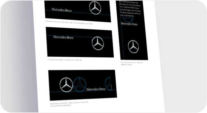 B. Linking Principles: distance, positioning and spacing between word mark and star. The alignment of the word mark/ claim is dependent on the position of the star, but is always oriented horizontally to the inner ring of the star. Print and online banners: Star bottom right = bottom alignment of word mark 3D media: Star top right = top alignment of word mark Print: Star centred at bottom = word mark left-aligned with text Digital media: Star top left = bottom alignment of word mark (word mark/claim right-aligned) Published August 2015, Rev. 10 Mercedes-Benz Brand Communication Standards l Page 35