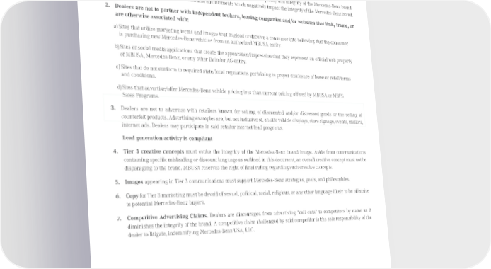 5. Compatibility with Mercedes‑Benz Strategies/Goals/Philosophies A. Media and Creative 1. Local dealer media buys are to be comprised of media that reflects the quality and integrity of the Mercedes-Benz brand. Avoid advertising placement in undesirable environments which negatively impact the integrity of the Mercedes-Benz brand. 2. Dealers are not to partner with independent brokers, leasing companies and/or websites that link, frame, or are otherwise associated with: a) Sites that utilize marketing terms and images that mislead or deceive a consumer into believing that the consumer is purchasing new Mercedes-Benz vehicles from an authorized MBUSA entity. b) Sites or social media applications that create the appearance/impression that they represent an official web property of MBUSA, Mercedes-Benz, or any other Daimler AG entity. c) Sites that do not conform to required state/local regulations pertaining to proper disclosure of lease or retail terms and conditions. d) Sites that advertise/offer Mercedes-Benz vehicle pricing less than current pricing offered by MBUSA or MBFS Sales Programs. 3. Dealers are not to advertise with retailers known for selling of discounted and/or distressed goods or the selling of counterfeit products. Advertising examples are, but not inclusive of, on-site vehicle displays, store signage, events, mailers, internet ads. Dealers may participate in said retailer internet lead programs. Lead generation activity is compliant 4. Tier 3 creative concepts must evoke the integrity of the Mercedes-Benz brand image. Aside from communications containing specific misleading or discount language as outlined in this document, an overall creative concept must not be disparaging to the brand. MBUSA reserves the right of final ruling regarding such creative concepts. 5. Images appearing in Tier 3 communications must support Mercedes-Benz strategies, goals, and philosophies. 6. Copy for Tier 3 marketing must be devoid of sexual, political, racial, religious, or any other language likely to be offensive to potential Mercedes-Benz buyers. 7. Competitive Advertising Claims. Dealers are discouraged from advertising “call outs” to competitors by name as it diminishes the integrity of the brand. A competitive claim challenged by said competitor is the sole responsibility of the dealer to litigate, indemnifying Mercedes-Benz USA, LLC. Published August 2015, Rev. 10 Mercedes-Benz Brand Communication Standards l Page 18