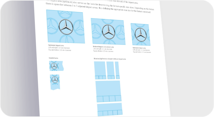 B. Impact Area: An impact area is defined around the star. No other elements are to be positioned in this area. In case of restricted space or limitations resulting from specified layouts and grids, the star may be used with a minimal impact area in exceptional circumstances. Unless otherwise defined, the star is positioned at the edge of the format with the aid of the impact area. The impact area (optimum) also serves as the basis for determining the format-specific star sizes. Depending on the format there is space for between 1 to 5 adjacent impact areas, thus defining the appropriate star size for the format concerned. Optimum impact area Reduced impact area (dealer ads) Optimaum impact area Left and right: 3/4 star diameter Left and right: 3/4 star diameter Left and right: 1/4 star diameter Top and bottom: 1/2 star diameter Top and bottom: 1/3 star diameter Top and bottom: 1/4 star diameter Limited area Relationship between format width and impact area Impact area (optimal) as basis for star sizing Published August 2015, Rev. 10 Mercedes-Benz Brand Communication Standards l Page 32