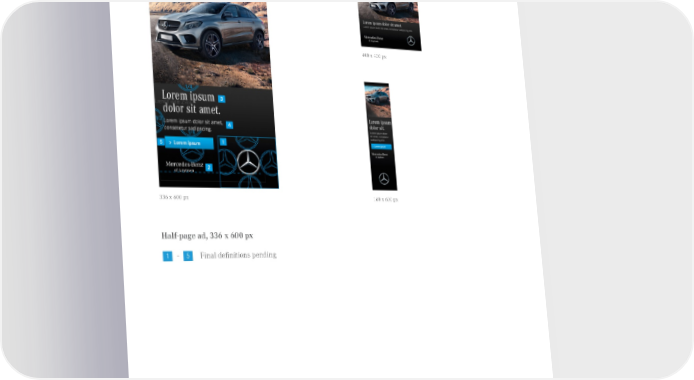 J. Online Banners – Portrait 400 x 400 px Layout split 2:4:4 336 x 600 px 160 x 600 px Half-page ad, 336 x 600 px 1 5 1 - Final definitions pending px = pixel Published August 2015, Rev. 10 Mercedes-Benz Brand Communication Standards l Page 51