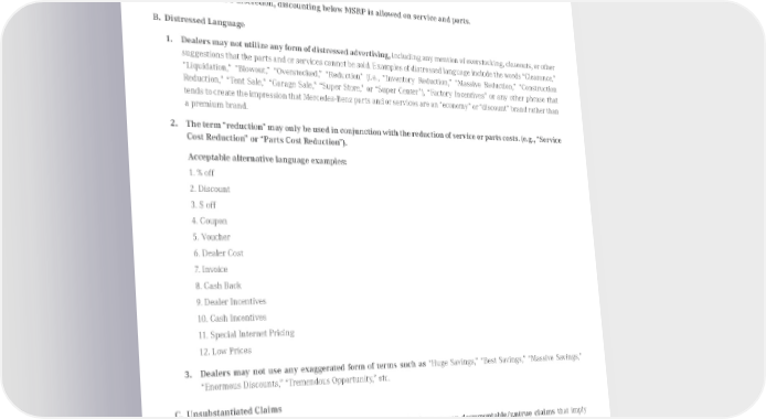 6. Service Marketing Language Usage A. Discounting 1. At the dealer’s discretion, discounting below MSRP is allowed on service and parts. B. Distressed Language 1. Dealers may not utilize any form of distressed advertising, including any mention of overstocking, closeouts, or other suggestions that the parts and or services cannot be sold. Examples of distressed language include the words “Clearance,” “Liquidation,” “Blowout,” “Overstocked,” “Reduction” (i.e., “Inventory Reduction,” “Massive Reduction,” “Construction Reduction,” “Tent Sale,” “Garage Sale,” “Super Store,” or “Super Center”), “Factory Incentives” or any other phrase that tends to create the impression that Mercedes-Benz parts and or services are an “economy” or “discount” brand rather than a premium brand. 2. The term “reduction” may only be used in conjunction with the reduction of service or parts costs. (e.g., “Service Cost Reduction” or “Parts Cost Reduction”). Acceptable alternative language examples: 1. % off 2. Discount 3. $ off 4. Coupon 5. Voucher 6. Dealer Cost 7. Invoice 8. Cash Back 9. Dealer Incentives 10. Cash Incentives 11. Special Internet Pricing 12. Low Prices 3. Dealers may not use any exaggerated form of terms such as “Huge Savings,” “Best Savings,” “Massive Savings,” “Enormous Discounts,” “Tremendous Opportunity,” etc. C. Unsubstantiated Claims 1. Dealers may not publish or air disparaging communications or non-documentable/untrue claims that imply that a dealer is in a preferred position as compared with other Mercedes-Benz dealers. Dealers may not use superlatives or make claims about their Mercedes-Benz dealership without first substantiating and documenting those claims with their MBUSA Regional OfÏce. The source for any superlatives or claims that appear in consumer-oriented marketing must be shown in a disclaimer. Superlatives such as “biggest,” “best,” “largest,” “first,” “only,” “most aggressive,” “most professional,” “friendliest,” “easiest to accommodate,” “largest inventory,” “fastest growing,” and other similar phrases are often impossible to document or require significant disclaimer. Published August 2015, Rev. 10 Mercedes-Benz Brand Communication Standards l Page 20
