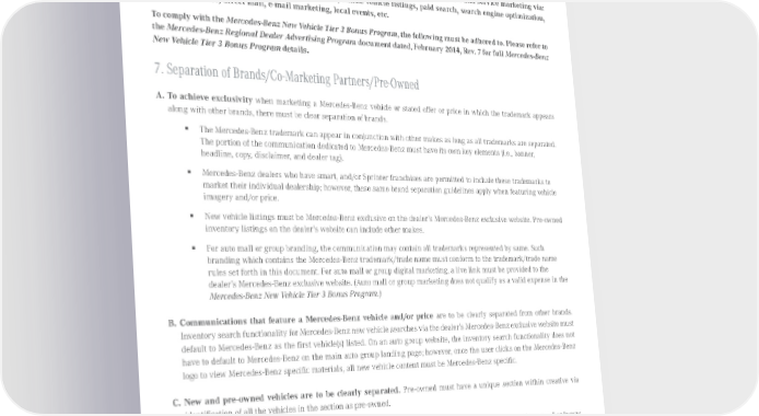 SECTION II This section documents Category II Infractions of the Mercedes‑Benz New Vehicle Tier 3 Bonus Program: Inclusive of, but not limited to paid, non-paid, and added value marketing for new vehicle and service marketing via: traditional and digital advertising, dealer websites, online vehicle listings, paid search, search engine optimization, social media sites, direct mail, e-mail marketing, local events, etc. To comply with the Mercedes‑Benz New Vehicle Tier 3 Bonus Program, the following must be adhered to. Please refer to the Mercedes‑Benz Regional Dealer Advertising Program document dated, February 2014, Rev. 7 for full Mercedes‑Benz New Vehicle Tier 3 Bonus Program details. 7. Separation of Brands/Co‑Marketing Partners/Pre‑Owned A. To achieve exclusivity when marketing a Mercedes-Benz vehicle or stated offer or price in which the trademark appears along with other brands, there must be clear separation of brands. ƒ The Mercedes-Benz trademark can appear in conjunction with other makes as long as all trademarks are separated. The portion of the communication dedicated to Mercedes-Benz must have its own key elements (i.e., banner, headline, copy, disclaimer, and dealer tag). ƒ Mercedes-Benz dealers who have smart, and/or Sprinter franchises are permitted to include these trademarks to market their individual dealership; however, these same brand separation guidelines apply when featuring vehicle imagery and/or price. ƒ New vehicle listings must be Mercedes-Benz exclusive on the dealer’s Mercedes-Benz exclusive website. Pre-owned inventory listings on the dealer’s website can include other makes. ƒ For auto mall or group branding, the communication may contain all trademarks represented by same. Such branding which contains the Mercedes-Benz trademark/trade name must conform to the trademark/trade name rules set forth in this document. For auto mall or group digital marketing, a live link must be provided to the dealer’s Mercedes-Benz exclusive website. (Auto mall or group marketing does not qualify as a valid expense in the Mercedes‑Benz New Vehicle Tier 3 Bonus Program.) B. Communications that feature a Mercedes-Benz vehicle and/or price are to be clearly separated from other brands. Inventory search functionality for Mercedes-Benz new vehicle searches via the dealer’s Mercedes-Benz exclusive website must default to Mercedes-Benz as the first vehicle(s) listed. On an auto group website, the inventory search functionality does not have to default to Mercedes-Benz on the main auto group landing page; however, once the user clicks on the Mercedes-Benz logo to view Mercedes-Benz specific materials, all new vehicle content must be Mercedes-Benz specific. C. New and pre-owned vehicles are to be clearly separated. Pre-owned must have a unique section within creative via identification of all the vehicles in the section as pre-owned. D. Dealer URLs that mention non Mercedes-Benz makes/brands are not permitted; i.e., “www.smithmbbmw.com” or “www. smithjeepMercedes-Benz.com.” Conversely URLs inclusive of the Mercedes-Benz trade name or form of the Mercedes-Benz trade name must provide Mercedes-Benz exclusive content. Published August 2015, Rev. 10 Mercedes-Benz Brand Communication Standards l Page 30