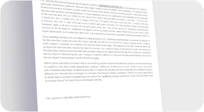 Introduction The “Mercedes-Benz Brand Communication Standards” (MBBCS), published July 2015, Rev. 10 by Mercedes-Benz USA (MBUSA) supercedes all previously published “Mercedes-Benz Brand Communication Standards” and/or guidelines. The “Mercedes-Benz Brand Communication Standards” provides authorized Mercedes-Benz dealers with the essential principles to effectively market Mercedes-Benz products and their dealership in a brand-commensurate manner. Additionally, these standards are the framework for the Mercedes-Benz USA, LLC (MBUSA) New Vehicle Tier 3 Bonus Program (effective January 1, 2010, Rev. 1: July 2010, Rev. 2: March 2011, Rev. 3: October 2011, Rev. 4: January 2012, Rev. 5: November 2012, Rev. 6: July 2013, Rev. 7: February 2014, Rev. 8: February 2015, Rev. 9: April 2015) and remain in effect until noted otherwise. The “Mercedes-Benz Brand Communication Standards” apply to all forms of paid and non-paid (added value) Tier 3 new vehicle and service marketing communications, inclusive of, but not limited to: traditional and digital advertising, dealer websites, online vehicle listings, paid search, search engine optimization, social media sites, direct mail, e-mail marketing, local events, geographic marketing parameters (AOI), etc. These marketing standards are to be adhered to when preparing Tier 3 marketing communications to maintain the integrity of the Mercedes-Benz brand and assure the dealer’s eligibility for MBUSA New Vehicle Tier 3 Bonus Program monies. Violations of the Category I standards are harmful to the Mercedes-Benz brand image. Non-compliance with these standards lowers the prestige of the Mercedes-Benz brand in the mind of consumers, has a negative impact on the historically high value retention of Mercedes-Benz vehicles and the Mercedes-Benz franchise and gives the impression that Mercedes-Benz vehicles are commodities that are subject to “distressed goods sales.” Category II standards address very important branding and marketing best practices that are integral to maintaining consistent brand messaging. MBUSA places good faith in its dealer body to do everything possible to market Mercedes-Benz products and their dealership(s) in compliance with these brand communication standards. Additionally, in the planning of new vehicle services, local events and co-branded sponsorships, the dealer in good faith will employ non-predatory practices within their area of influence (AOI) as defined in the “Mercedes-Benz Passenger Car and Light Truck Dealer Franchise Agreements.” MBUSA also places good faith in its dealer body to accurately document their new vehicle Tier 3 marketing expenses as instructed in the “Mercedes-Benz Dealer Accounting Manual” for Dealer Financial Statement reporting. (Tier 3 pertains to individual dealer marketing.) Published August 2015, Rev. 10 Mercedes-Benz Brand Communication Standards l Page 1