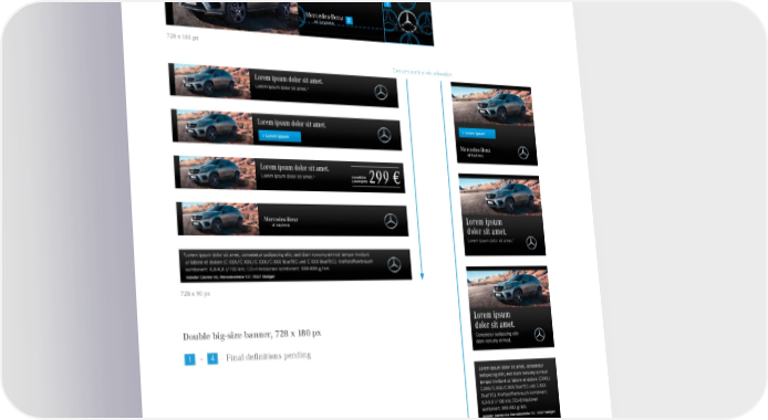 J. Online Banners – Portrait 364 px 364 px 1/3 728 x 180 px Content control via animation 728 x 90 px Double big-size banner, 728 x 180 px 1 4 1 - Final definitions pending 300 x 250 px px = pixel Published August 2015, Rev. 10 Mercedes-Benz Brand Communication Standards l Page 52