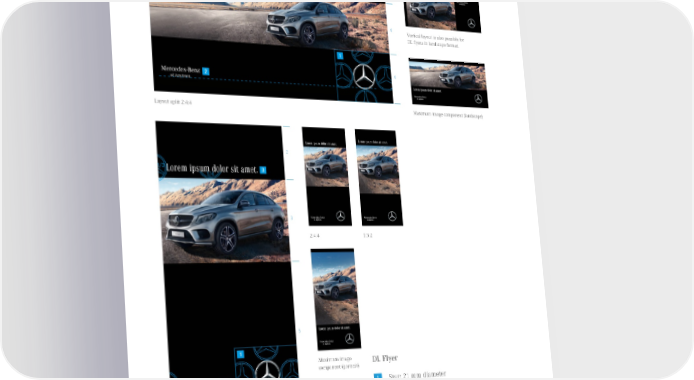 I. DL Flyers – Portrait and Landscape 2 4 Vertical layout is also possible for DL flyers in landscape format. 4 Layout split 2:4:4 Maximum image component (landscape) 2 3 2:4:4 1:3:2 5 Maximum image DL Flyer component (portrait) 1 1 Star: 21 mm diameter 2 2 Word mark/claim: 21% of database logo size (ML version) Layout split 2:3:5 Alignment: inner ring of star 3 3 Type size: 22.25 pt (CH 1/4 x) Type: Corporate A Condensed x = star diameter CH = cap height Published August 2015, Rev. 10 Mercedes-Benz Brand Communication Standards l Page 50