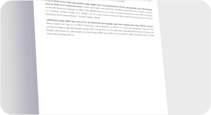 17. Art, Photography, and Video Footage A. Dealers must ensure that art, photography, and video footage in their communications is product/model year correct for the advertised vehicle. Dealers must pay particular attention to specific models and features and ensure that optional equipment is disclaimed. Please refer to “Specifics of Legal Disclaimer Language.” B. Dealers must ensure that appropriate usage rights have been purchased for all art, photography, and video footage used in their local communications. Usage rights have been secured for all MBUSA produced assets available to dealers on the RDA Resource Manager on https://mercedesmarketing.com as well as visuals on mbusa.com and/or MB social pages (i.e. Facebook, Twitter, Google+ etc.). Dealers are not to alter creative assets provided on mercedesmarketing.com. Required disclaimer for European images: European images shown. Additional usage rights may have to be purchased for photography and video footage from other MBUSA sources. Please submit your inquiry to MBUSA Marketing Communications via MBCCS to ensure that appropriate usage has been purchased before using photography and/or video footage from sources other than mercedesmarketing.com or mbusa.com. Dealers who misuse art, photography, or video footage will be responsible for all proprietary rights and legal expenses arising from such unauthorized use. Published August 2015, Rev. 10 Mercedes-Benz Brand Communication Standards l Page 61