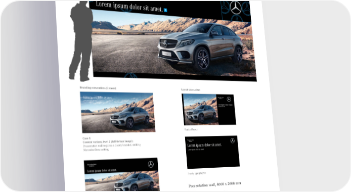M. Presentation Wall Branding conventions (2 cases) Layout alternatives Vertical layout Case 1 Context variant, level 2 (full-format image): Presentation wall requires a clearly branded, striking Mercedes-Benz setting. Purely typographic Presentation wall, 4000 x 2000 mm 1 1 Star: 320 mm diameter Case 2 Size: L version Standard variant (branded and black as background): Presentation wall can stand alone. 2 2 Word mark/claim: 320% of database logo size (ML version) Alignment: inner ring of star 3 3 Type size: 453.5 pt (CH 1/4 x) Type: Corporate A Condensed x = star diameter CH = cap height Published August 2015, Rev. 10 Mercedes-Benz Brand Communication Standards l Page 55